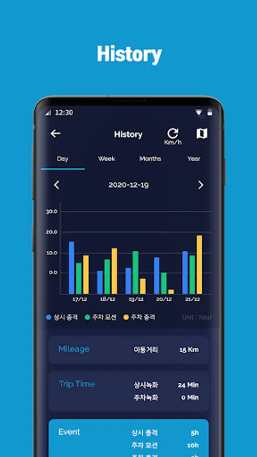 The information recorded in the black box is visualized and provided, such as the daily distance traveled, the number of events, total recording time, and driving speed.