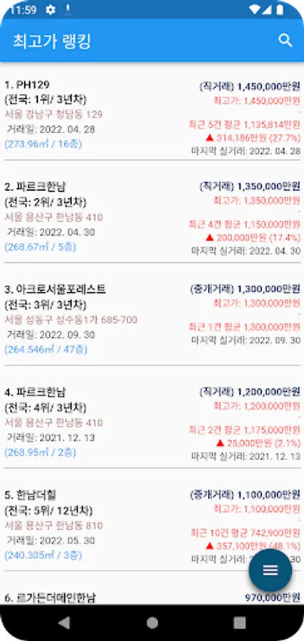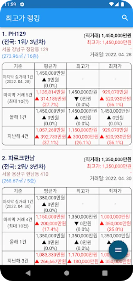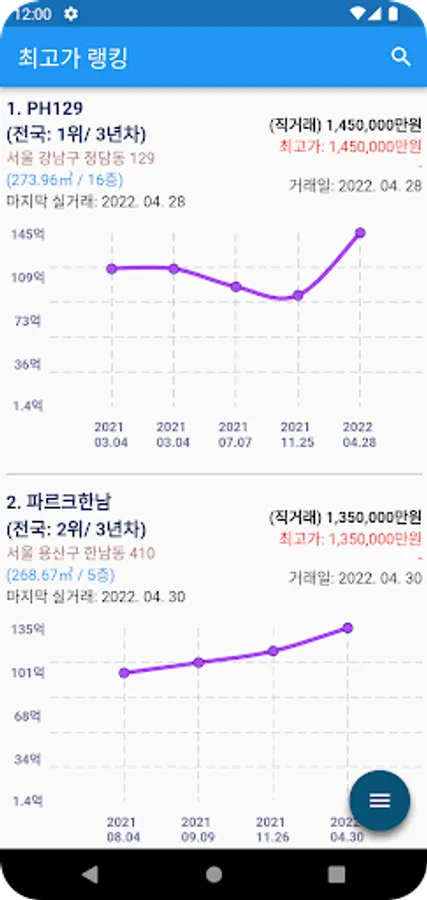 2. It is possible to check the highest price information for each apartment/square type in each area traded since 2006, the latest 100 actual transaction prices for the apartment type, and the highest price and difference.