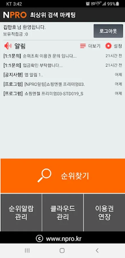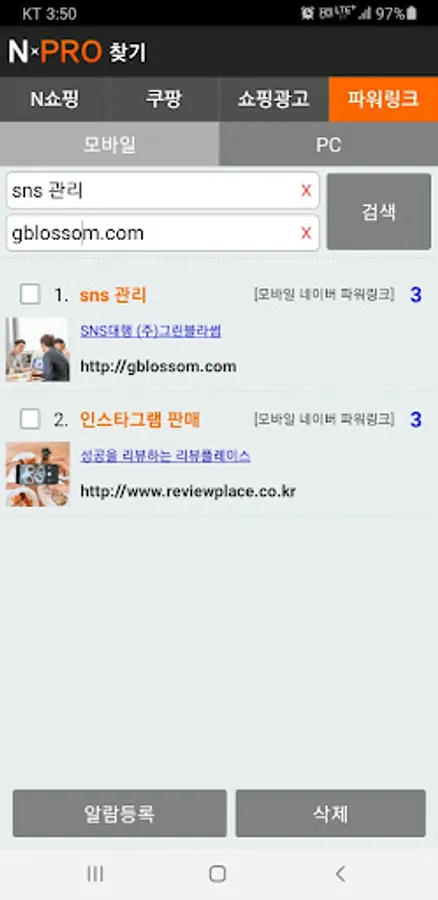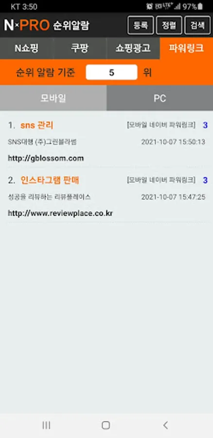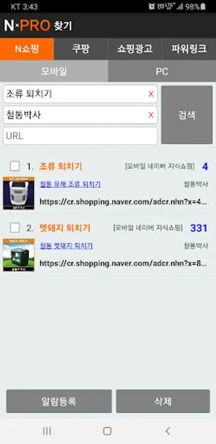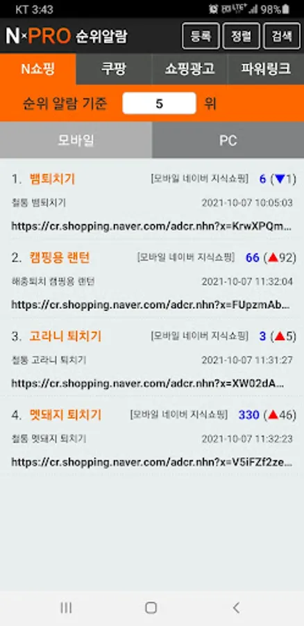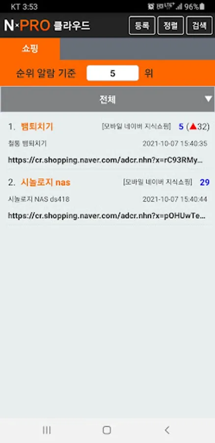 In the case of Naver and N Shopping, if you match “keywords” with keyword advertisements exposed as search results, and “URL” of products posted in shopping, respectively, and save them in the NPRO app, the search rankings are periodically checked and recorded, and the rankings are reached or reached. Sends an alert to the app when leaving.