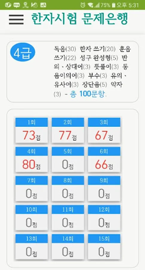 Based on the number of questions and the number of kanji tests administered by the Korean Society. Grade 8 (50 questions), Grade 7 II (60 questions), Grade 7 (70 questions), Grade 6 (80 questions), Grade 6 (90 questions), Grade 5 (100 questions), Grade 5 (100 questions) ), Level 4 (100 questions), Level 4 (100 questions), Level 3 (150 questions), Level 3 (150 questions), Level 2 (150 questions), Level 1 (200 questions) .