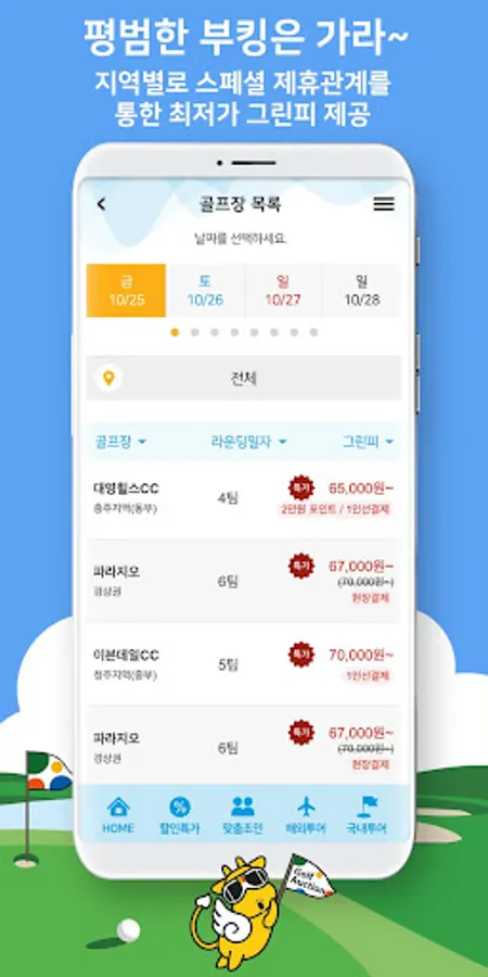 : 전국의 골프장 할인 부킹 및 지역별로 스페셜 제휴관계를 통한 최저가 그린피 제공 (예 : 아일랜드CC, 의성파라지오CC, 대영힐스CC 등)