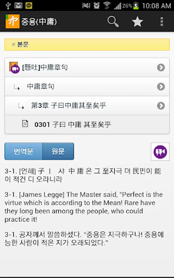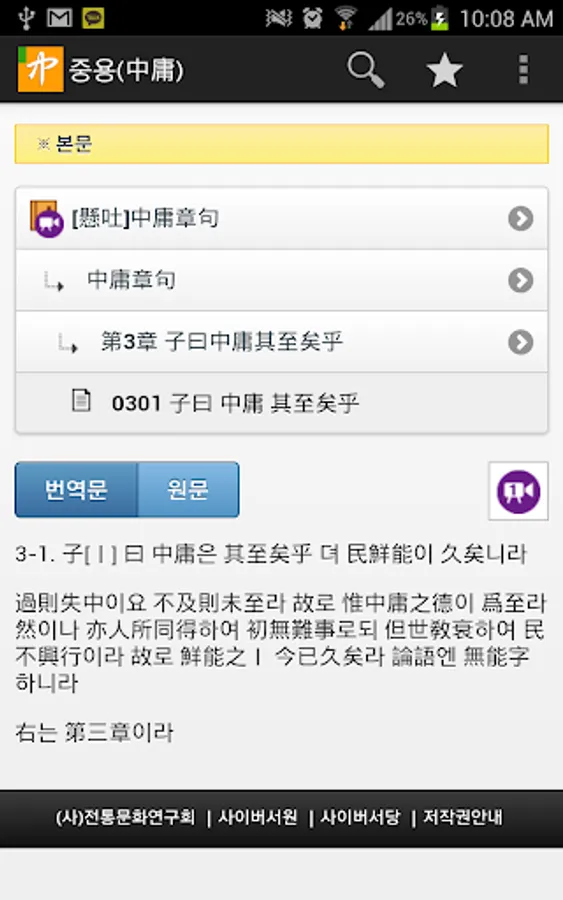 - 전통문화연구회 보급하고 있는 동양고전 앱 사서(논어論語,맹자孟子,대학大學,중용中庸)시리즈 중 하나인 중용 입니다.