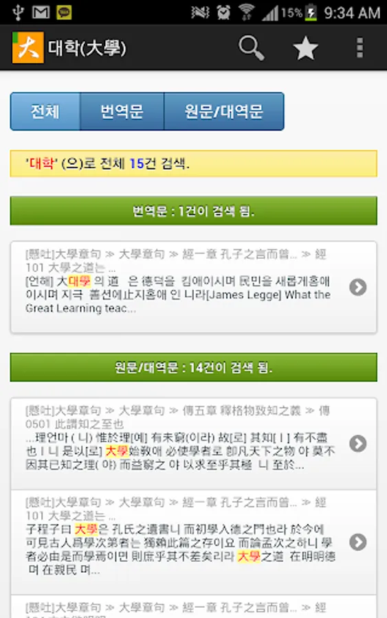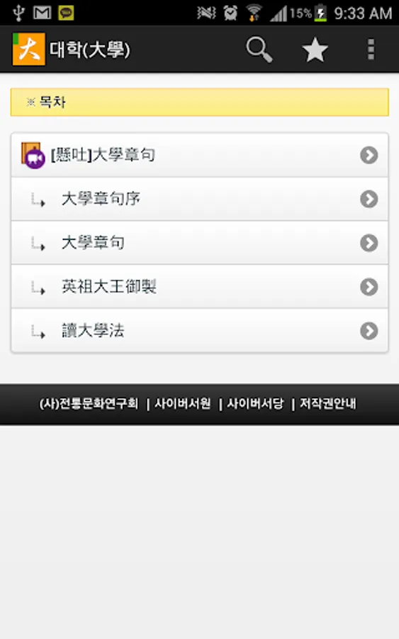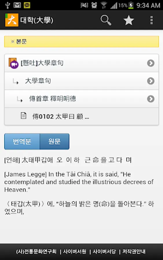 - 전통문화연구회 보급하고 있는 동양고전 앱 사서(논어論語,맹자孟子,대학大學,중용中庸)시리즈 중 하나인 대학 입니다.