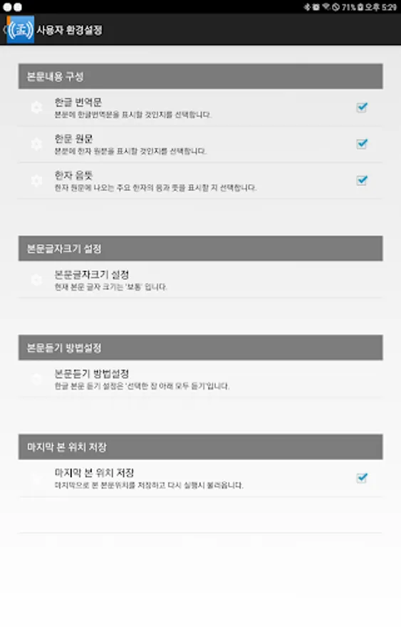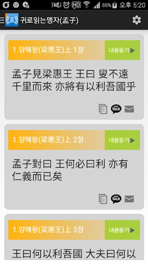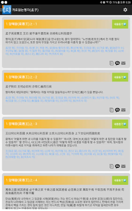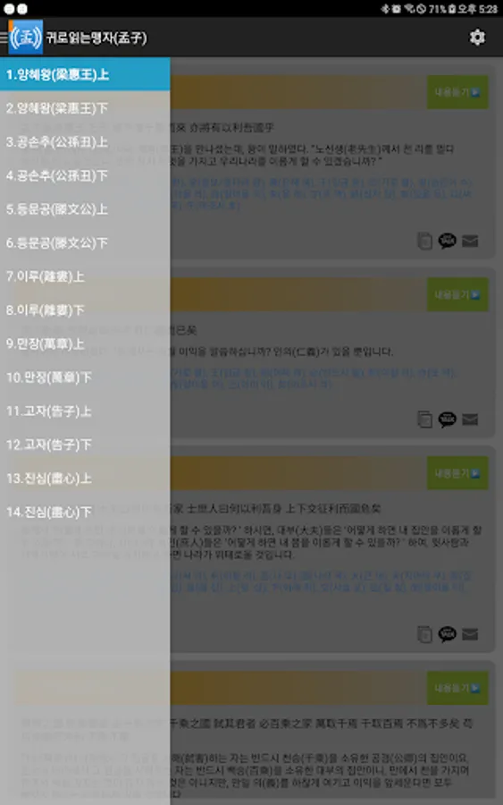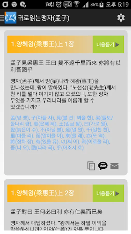 - 이 앱은 맹자 이루 상편까지는 자유롭게 무료로 이용할 수 있으며 이루 하편부터는 유료결제를 해야 전체를 이용할 수 있습니다. 비결제시 한자음의, 내용듣기 기능등 부가 기능을 사용할 수 없습니다.