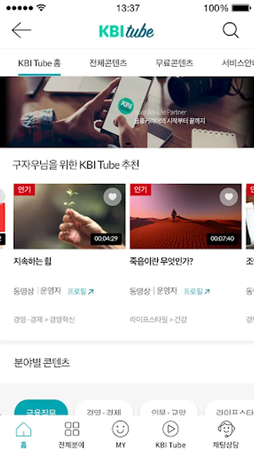 - KBItube메뉴 : 짧은 동영상으로 구성된 지식콘텐츠 서비스인 KBItube에서 제공하는 유, 무료 콘텐츠를 만날 수 있어요.