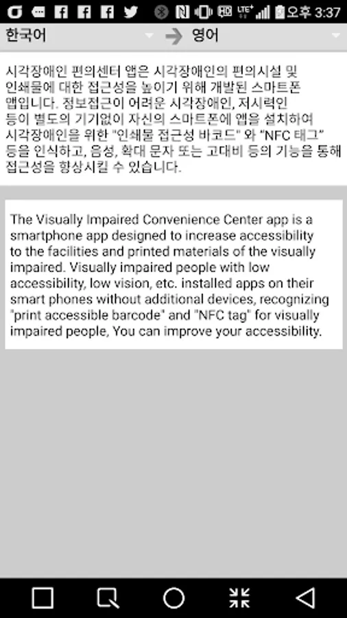 시각장애인 편의센터 앱은 시각장애인의 편의시설 및 인쇄물에 대한 접근성을 높이기 위해 개발된 스마트폰 앱입니다. 정보접근이 어려운 시각장애인, 저시력인 등이 별도의 기기없이 자신의 스마트폰에 앱을 설치하여 시각장애인을 위한 "인쇄물 접근성 바코드" 와 “NFC 태그” 등을 인식하고, 음성, 확대 문자 또는 고대비 등의 기능을 통해 접근성을 향상시킬 수 있습니다.