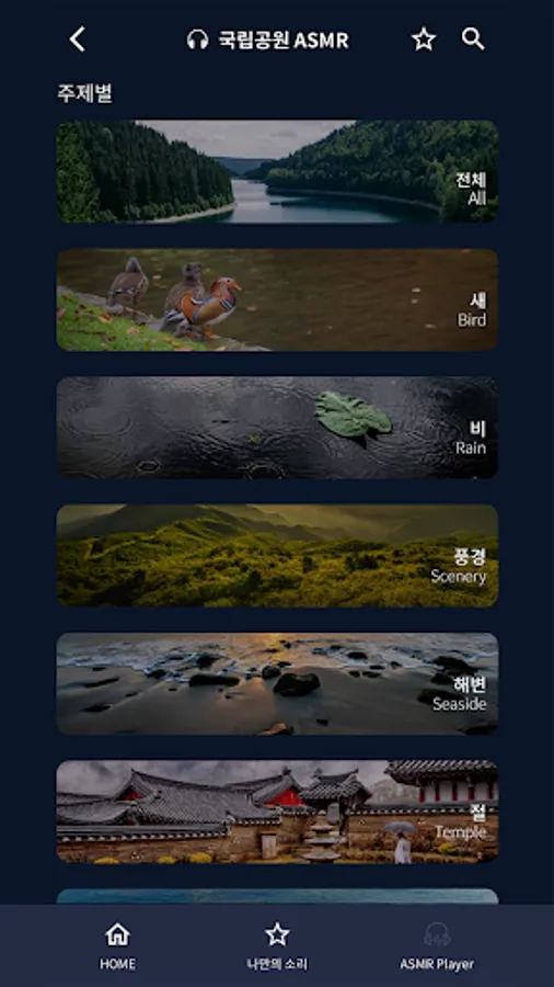 - Experience the high-quality ASMR of various national parks, such as Seoraksan National Park's 'Geumgang Chorong', Gyeongju National Park's 'Beopgosori', and Byeonsanbando National Park's 'Sea Sound of the Lion Rock'.