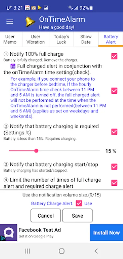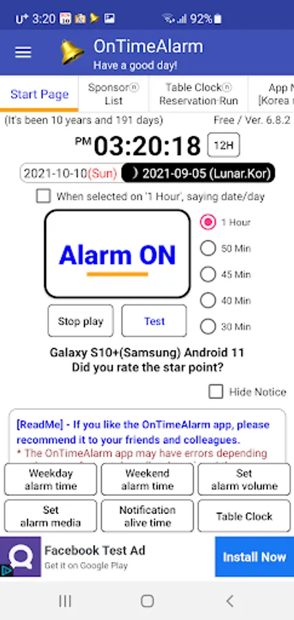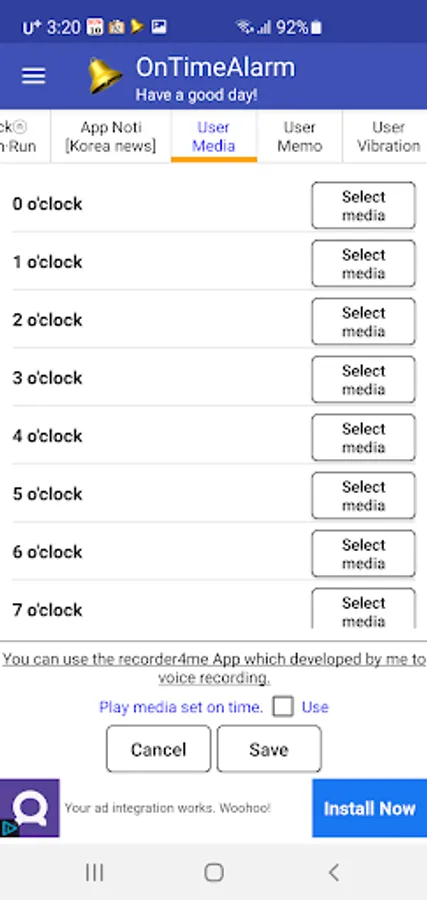 - At every hour on time(on time, every 50 minutes, every 45 minutes, every 40 minutes, every 30 minutes), play a designated alarm, MP3 or speak memo, or a vibration.