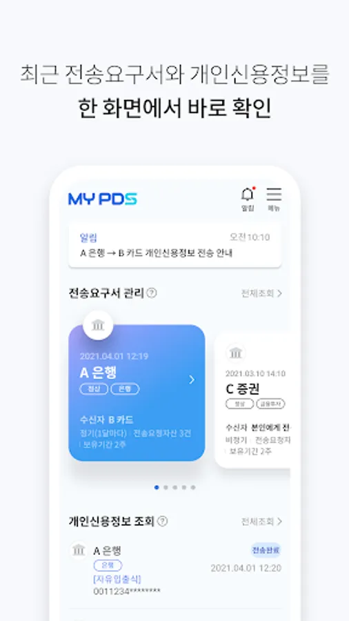 MyPDS is a mobile app developed and operated by the Korea Credit Information Service to support the exercise of the data subject's right to request transmission under the Credit Information Act.