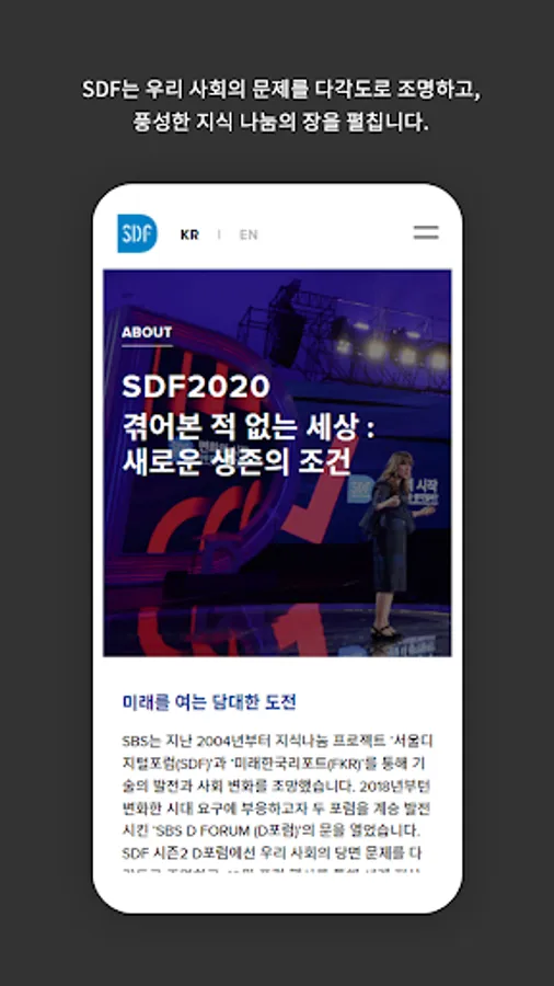 Since 2004, through the knowledge sharing project ‘Seoul Digital Forum (SDF)’ and ‘Future Korea Report (FKR)’, SBS has looked at technological development and social change.