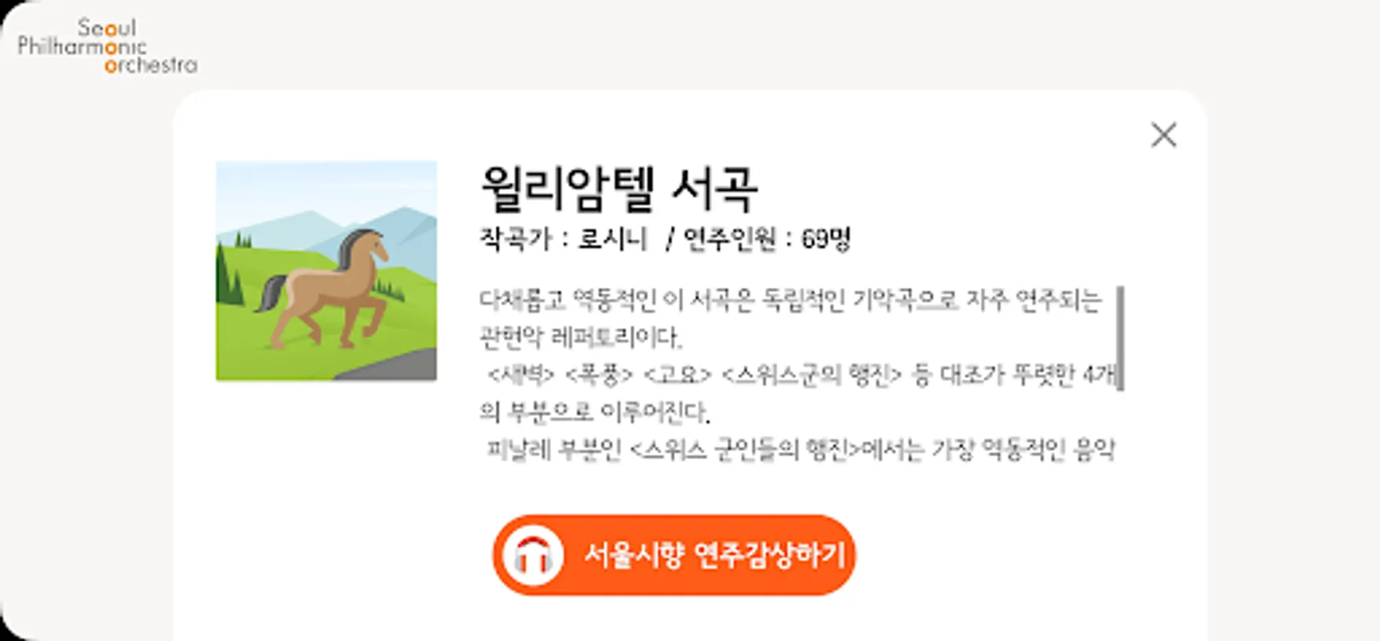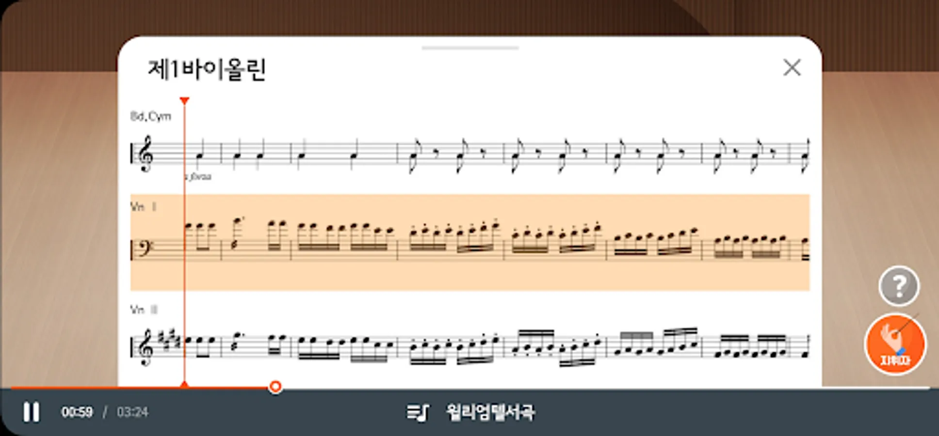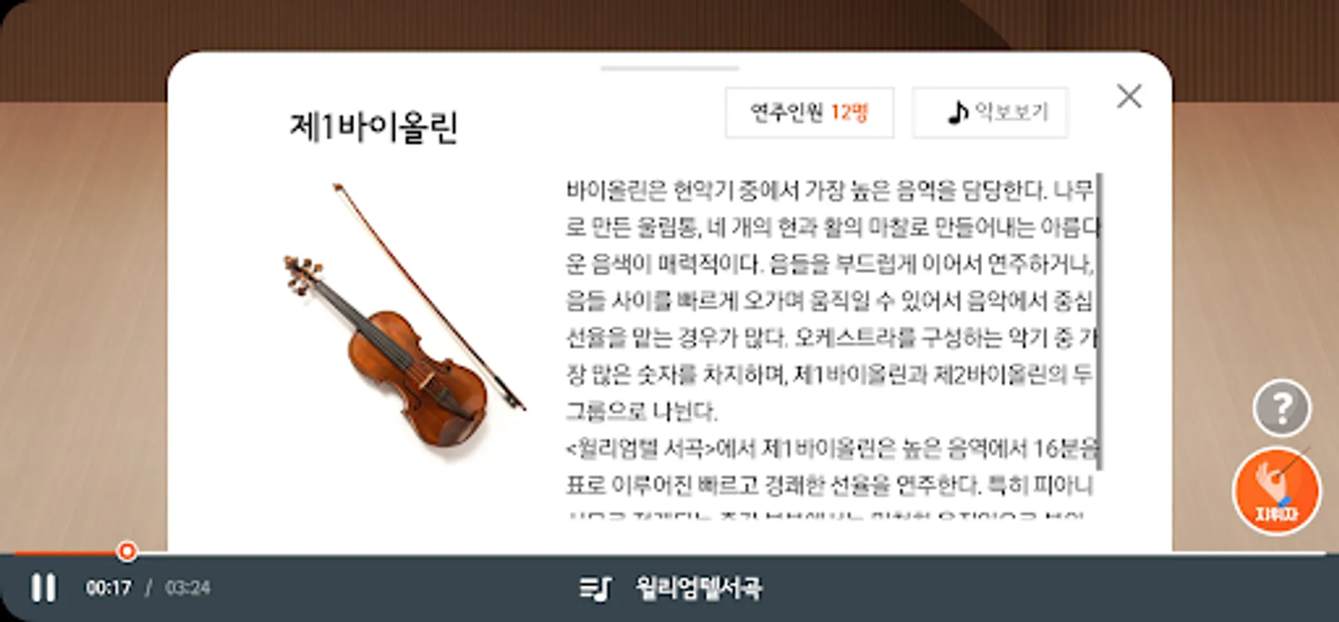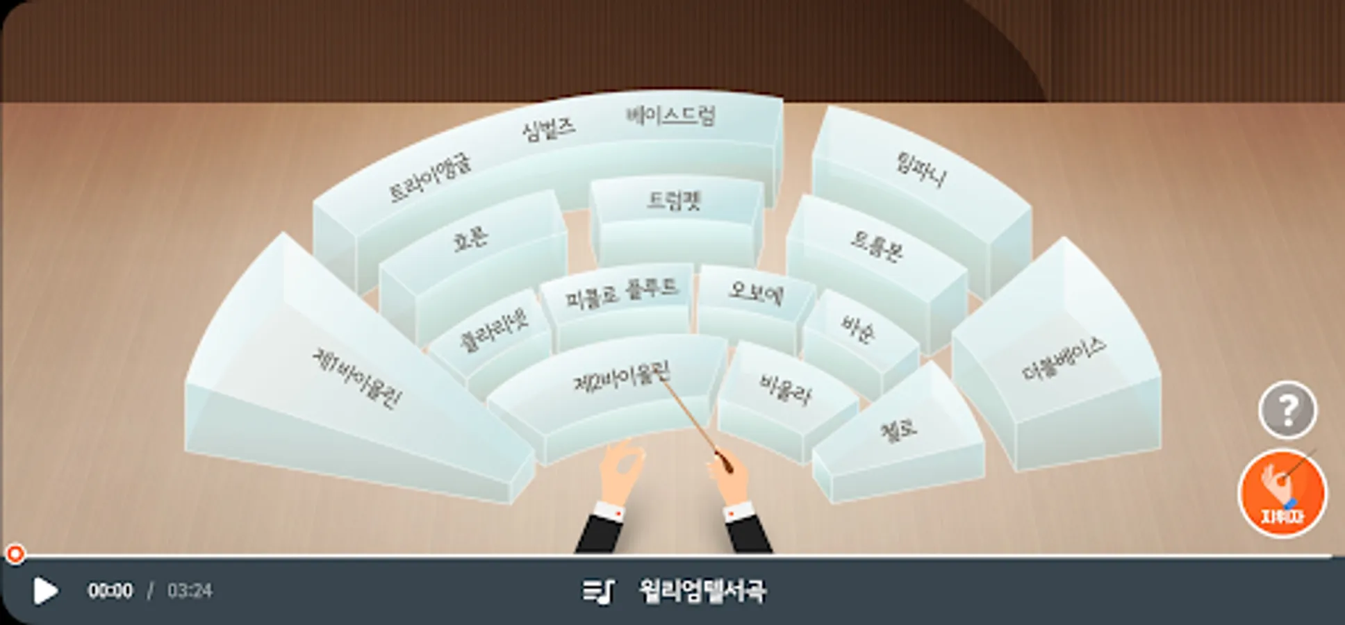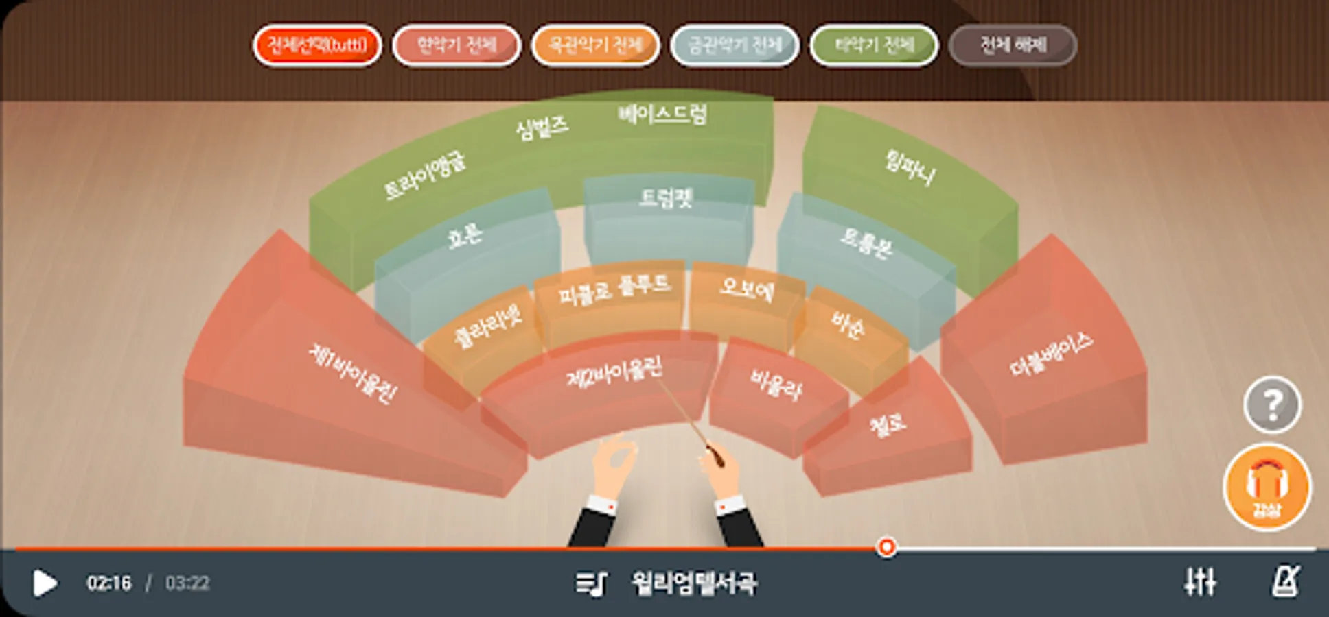 You can also read notation for a specific instrument family while the music is playing. Users can also be conductors. While the music is playing, you can listen to the performance of the instrument part you want to hear separately, or you can create your own ensemble by building up other instrument groups. Like a conductor, you can adjust the volume and speed of the sound to hear it.