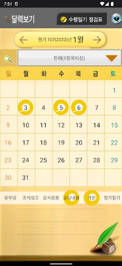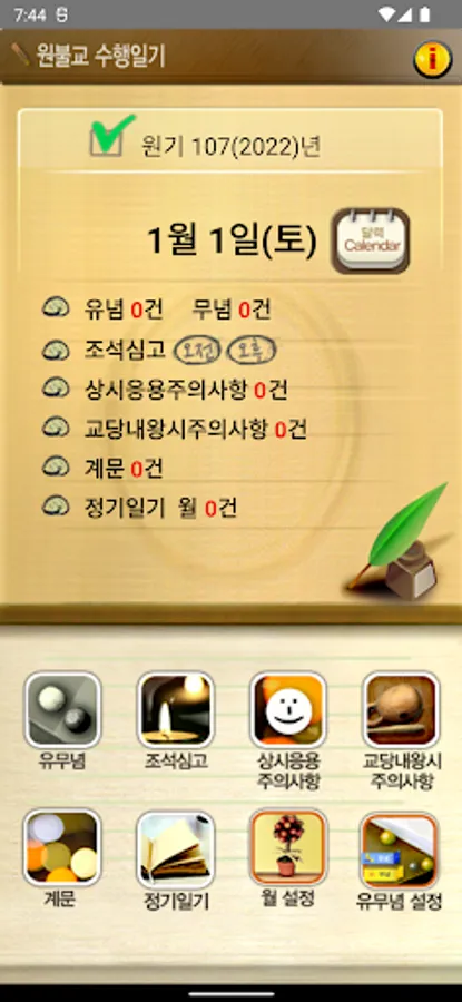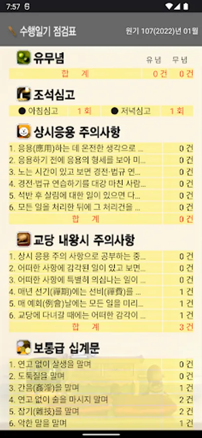 It is possible to record no-mindfulness, morning and evening, constant application precautions, cautions during visits to the church, gyeongmun, and regular diary suggested by Won Buddhism's diary method.