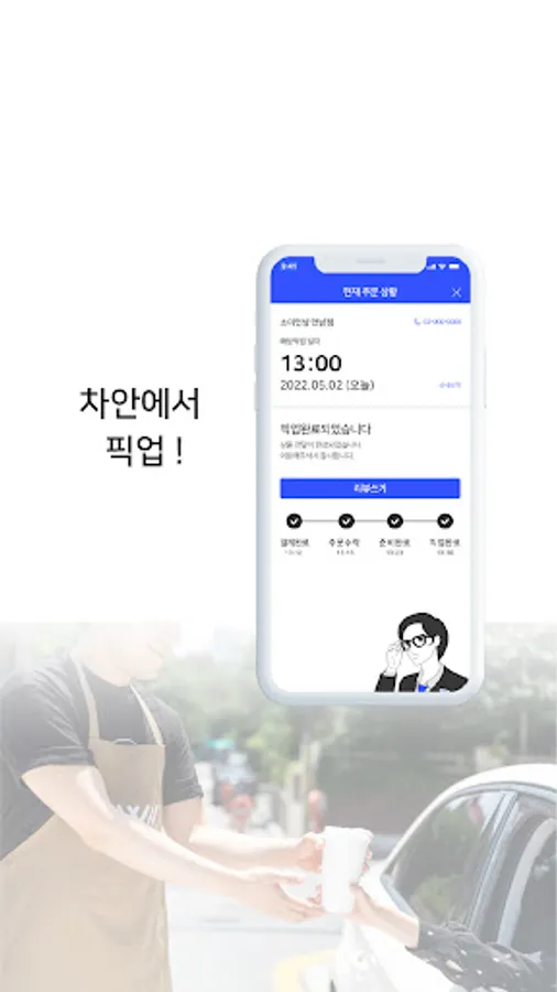 After arriving at the store, touch ‘Arrival Notification’ -> Receive the ordered product in the car!