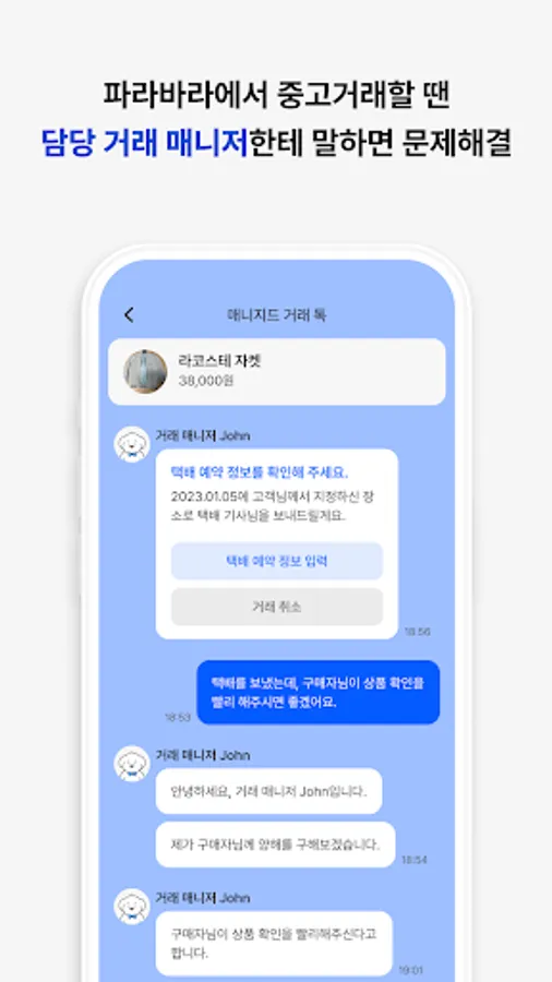 A: The transaction manager monitors all transactions in Parabara and responds in real time if a problem arises. If you use managed courier transaction, when the registered item is sold, if you leave the item in front of the door, the courier will be sent instead. In addition, through paraboxes installed in the surrounding area, it is possible to trade second-hand goods as quickly as lightning without meeting non-face-to-face.