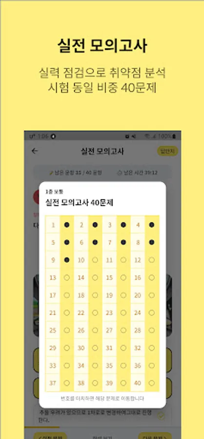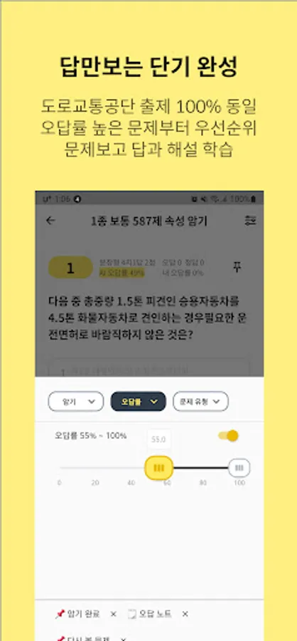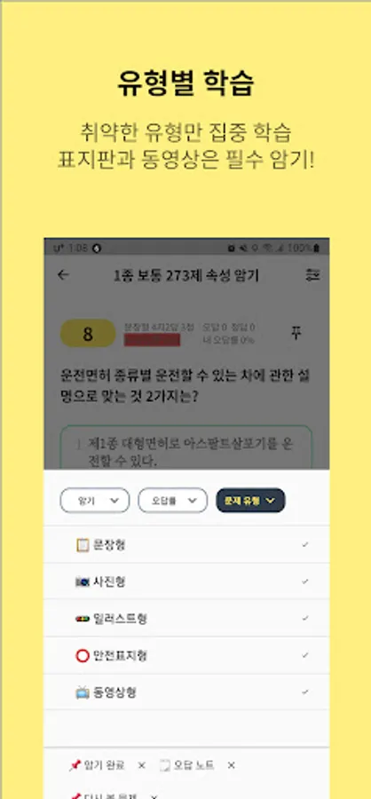 - You can memorize attributes by quickly and conveniently checking the answers and explanations of 1000 questions identical to the actual driver's license test with a vertical scrolling UI.