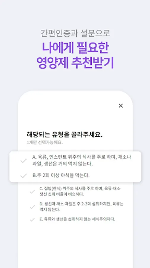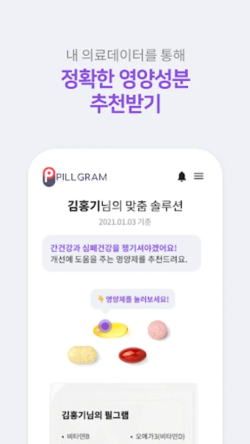 With KakaoTalk authentication, your medical data (health checkup record, medication record) is called and you are filled with nutrients that you lack, and you can also receive 1:1 customized management from experts, making it easier to maintain your health.