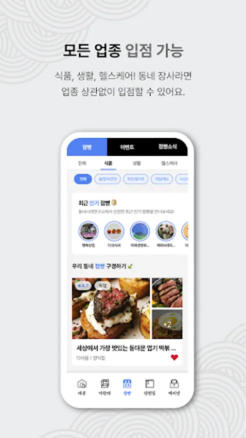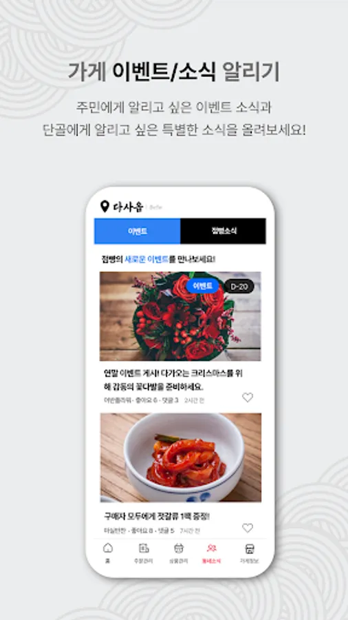 Any local store owner can apply for a store without any registration process or cost, and can register and sell products. Even if there is no delivery service, you can do business with the locals through ‘pick-up’ and ‘reservation’. Based on the dong of the store address, the store profile and products are exposed to the local residents. If you have any event news or new store news that you want to inform residents, please post and share!