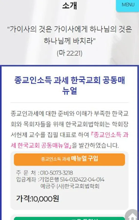 학회의 종교인과세 설명회에서 나온 질문과 목회자나 교회관계자들이 전화 또는 학회 홈페이지 게시판, 이메일 등을 통해 질문한 내용을 토대로 이해하기 쉽게 답하고 있다. 총 60페이지 200여개 항목으로 구성된 질의 응답은 목회자들이 알기 어려운 과세문제를 목회현장에서 발생하는 구체적인 문제를 가지고 피부에 와 닿게 설명하고 있습니다.