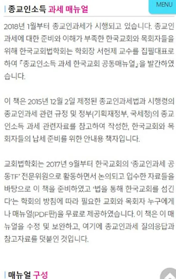 국세청이 발간한 ‘2018년 종교인소득신고 안내’ 를 기준으로 종교인소득의 유형과 개념, 소득신고납부절차, 세무조사, 근로장려금/자녀장려금 순으로 자세히 설명하고 있습니다.