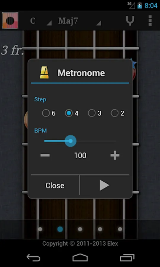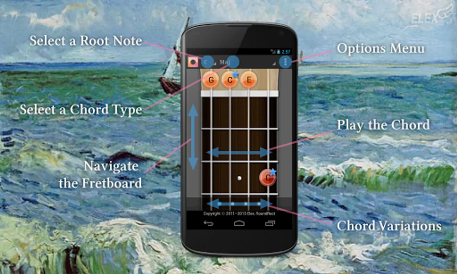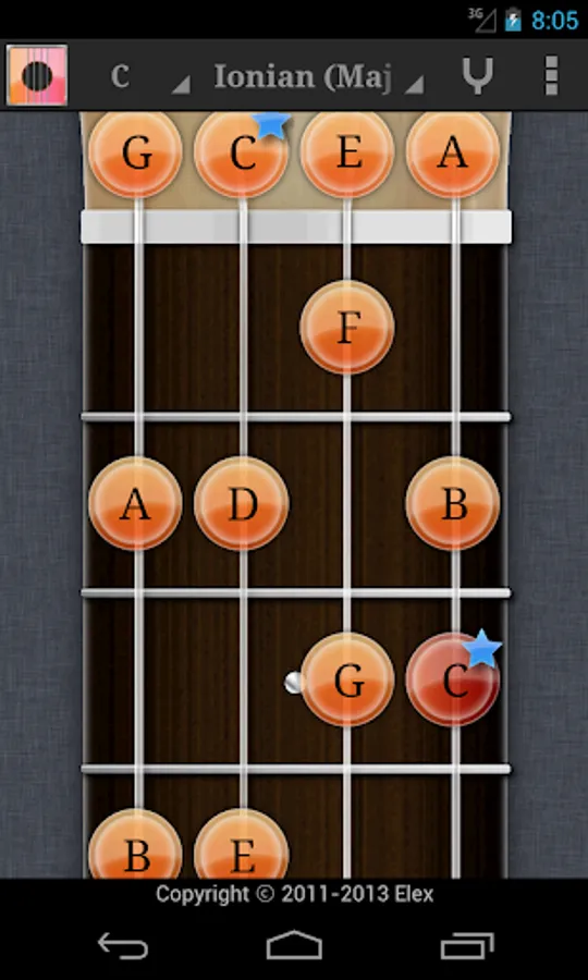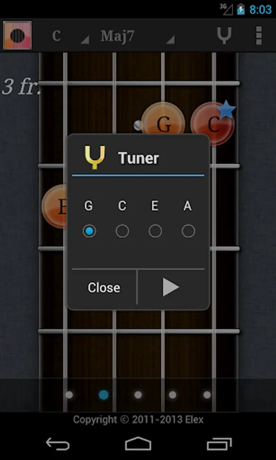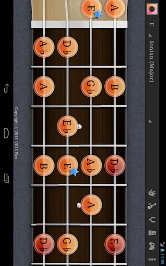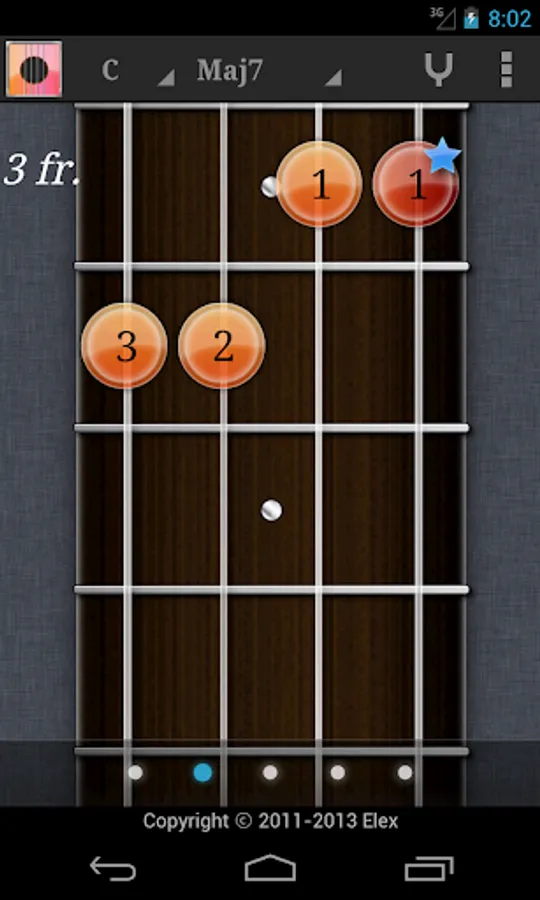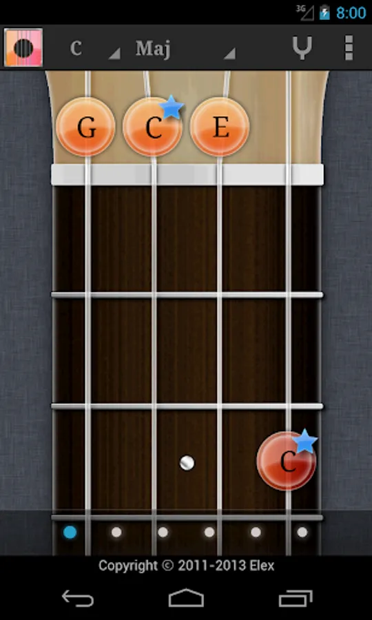Touch the fret on the screen to play sound. Rub the background to move the position of fret. And bottom bar for chord variation.