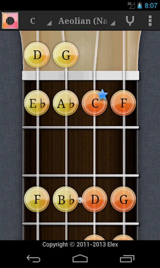 Note name can be displayed. Higher octave notes are distinguished by color. Root note is marked with a star.