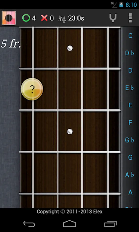 Be a master of the Fret! Fret Master is a simple game that is designed to help guitarists to memorize note names on the fretboard. Tell the note name of the given note on the fret, or conversly find a note on the fret that matches to the given note name.