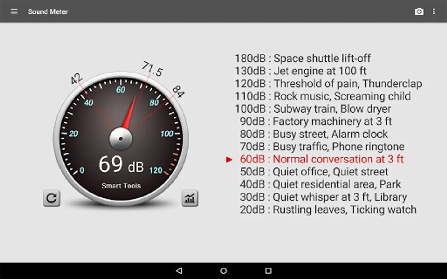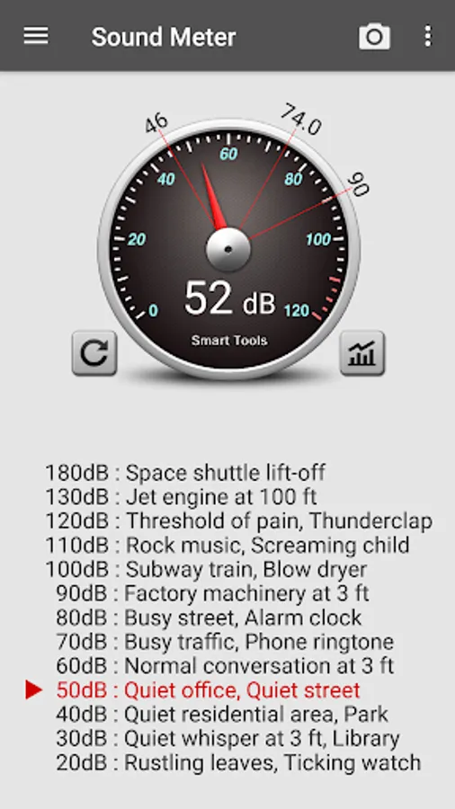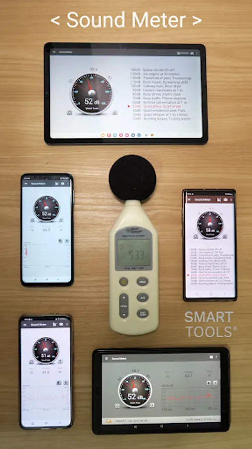 See 6th images. I calibrated major Android devices with an actual sound meter (dBA). You can trust the result in routine-noise levels (40-70dB). Please use it as an auxiliary tool.