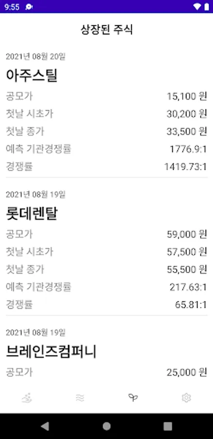 Listed stocks show the public offering price on the listing date, the opening price on the first day, the closing price on the first day, and the competition rate for the listed stocks.
