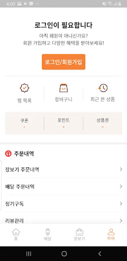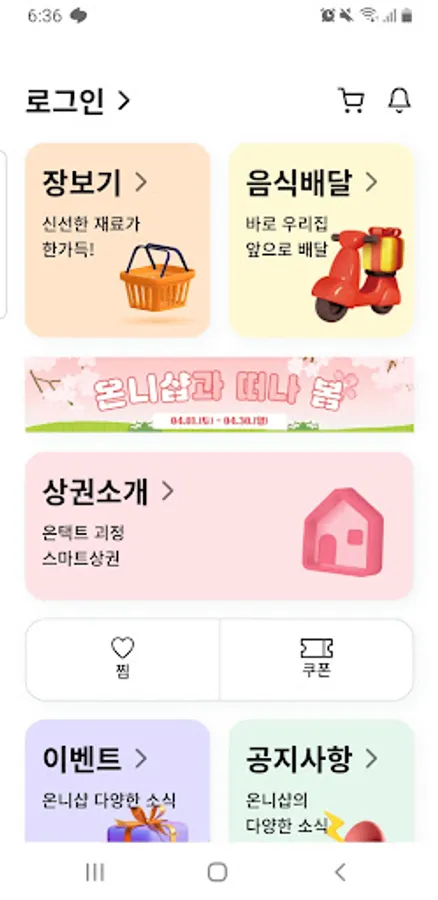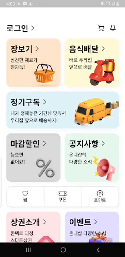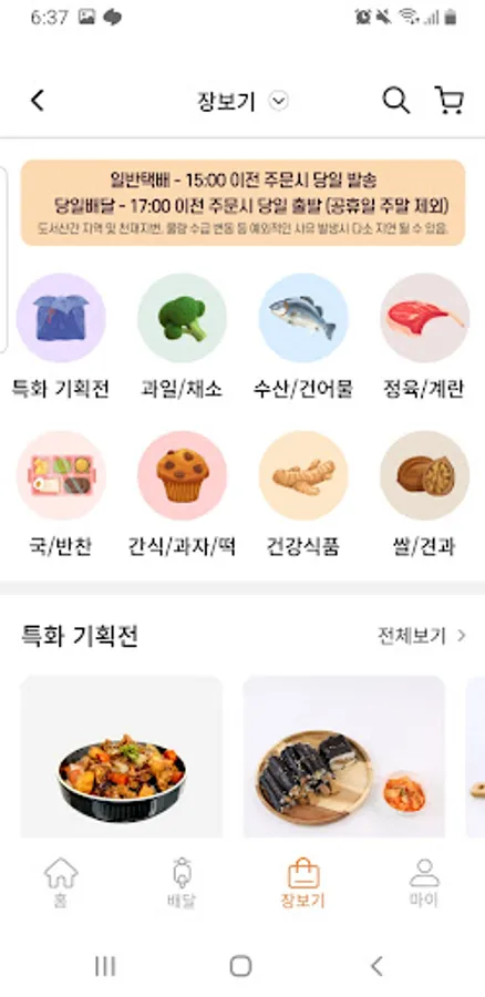 장보기, 음식배달, 정기구독, 마감할인, 이벤트로 다양한 상품을 한눈에 쉽게 확인할수 있습니다