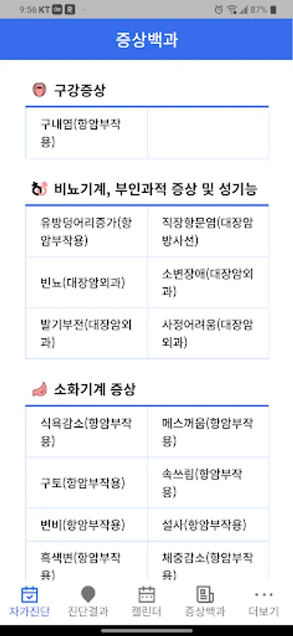 - Symptom input: You can record the current symptoms through a questionnaire for each side effect.