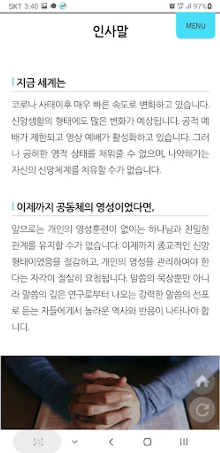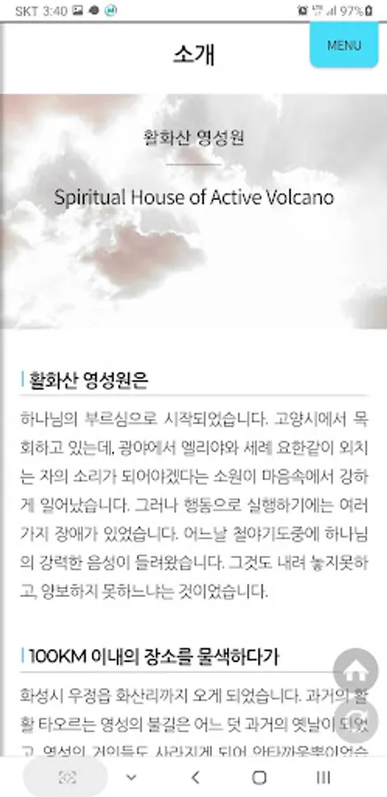 The active volcano spiritual center began with God's call. While I was pastoring in Goyang City, the wish to be the voice of those who cried like Elijah and John the Baptist in the wilderness arose strong in my heart. However, there were a number of obstacles to action in action. One day, during the all-night prayer, God's powerful voice came. I couldn't put it down and gave way.