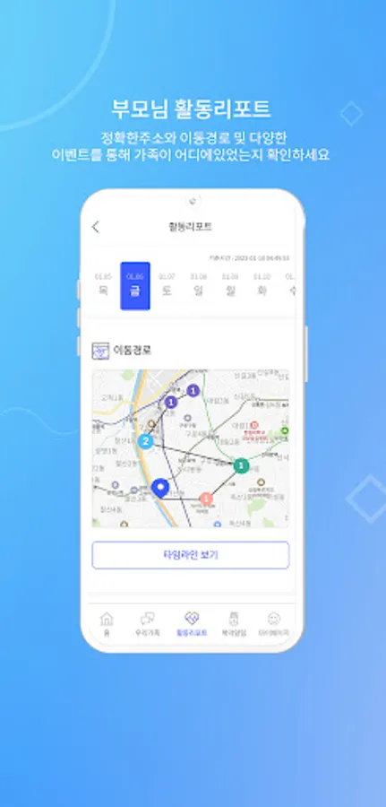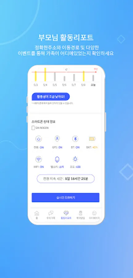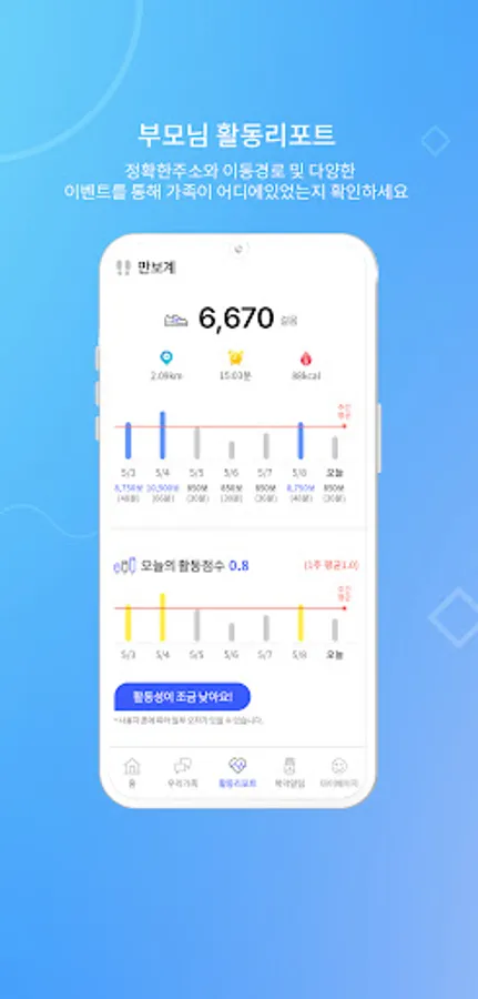 Activity reports of wards (parents), including offline real-life activities such as walking, major moving locations, and moving distances