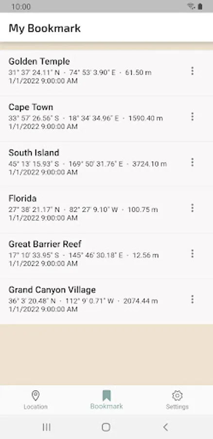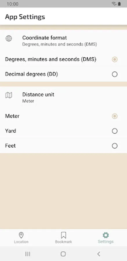 Check the GPS coordinates and altitude of your current location. Tap the latitude and longitude to copy it for easy pasting elsewhere. You can check your current location and saved locations in the Maps app. You can also share your location with people you know with the SMS button and share button. If you use the bookmark function, you can save the current location with a name, and it will be recorded in the bookmark tab. In the Bookmarks tab, you can see the history you have visited so far. In the app settings, you can choose whether to display the location format in DMS format or DD format. You can select one of Meter, Yard, and Feet as the unit of distance.