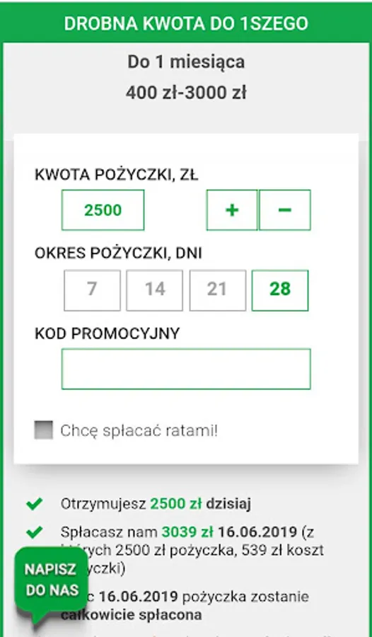You don't have to explain why or what you borrow money for. You can receive from PLN 200 to PLN 4,000 almost immediately. You choose the repayment date.