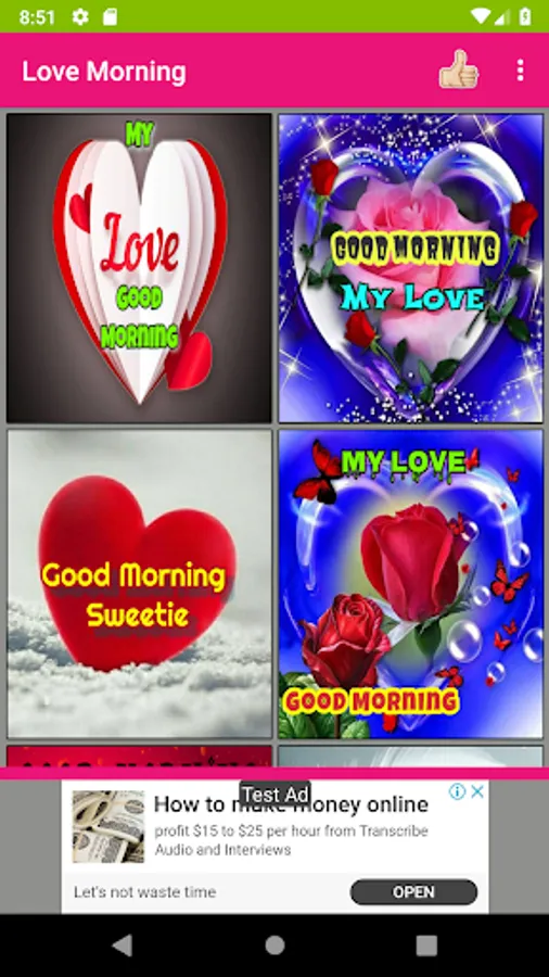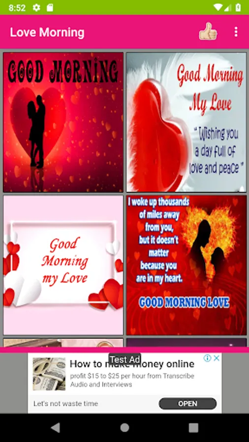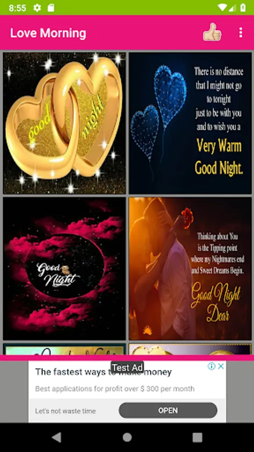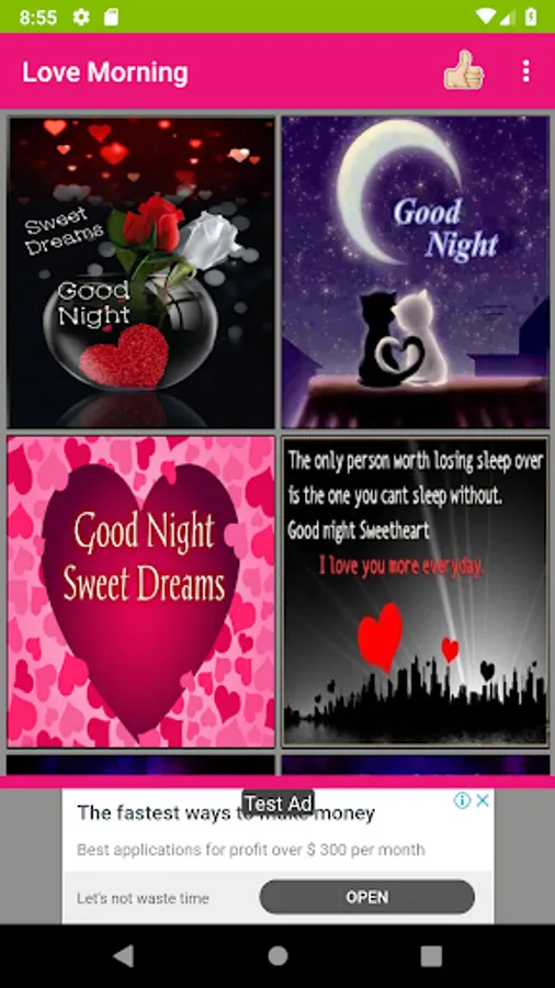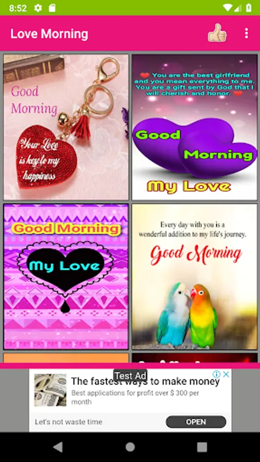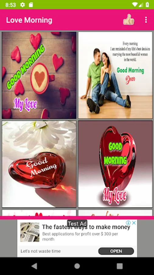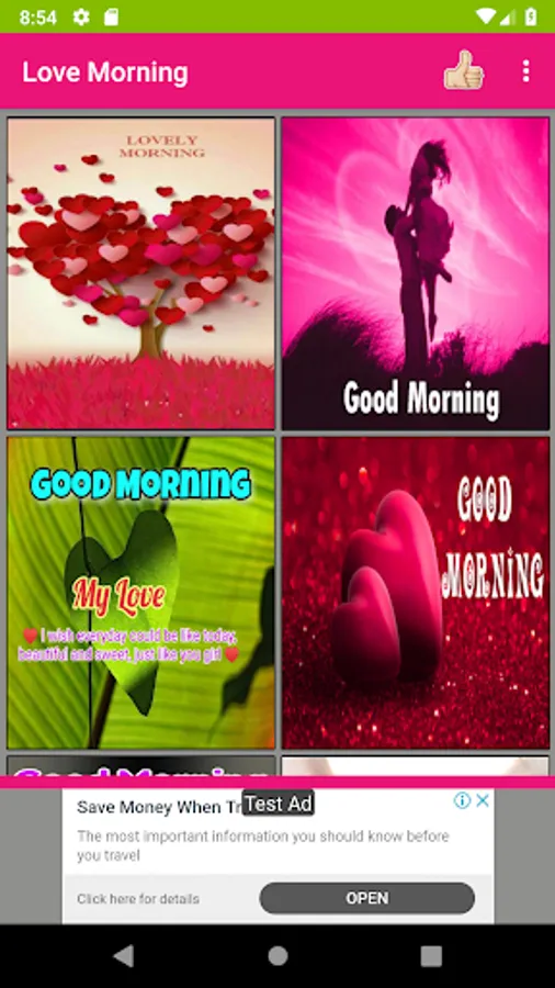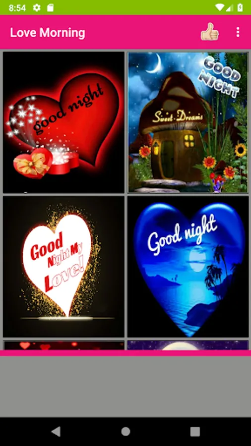 Here you can get more number of romantic pictures for love couples and convey daily good morning wishes and night wishes with love quotes and love images. This app is a collection of cheerful love photos with morning and night wishes that will not only spread the positive vibes but also expresses your likeness and care for your loved ones. Using this app, you can share more number of love images with good morning wishes quickly to your loved one's. It includes separate section for morning and night love pictures. Internet is needed only to share images to social messengers but not required to view photos. You can set any image as your phone wallpaper with single tap. Also, you can save any favorite image to your phone. This is free software mobile application.