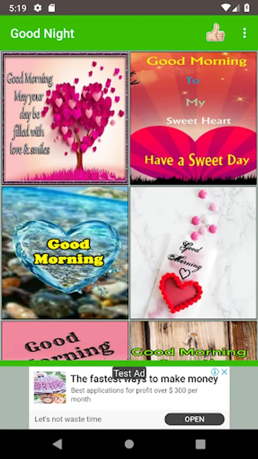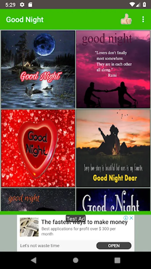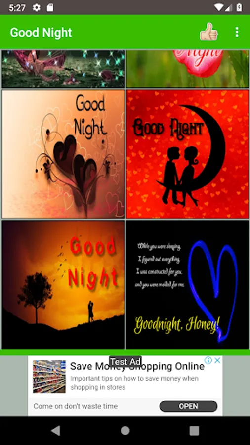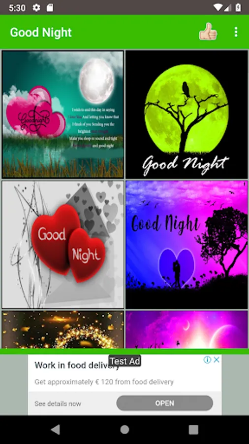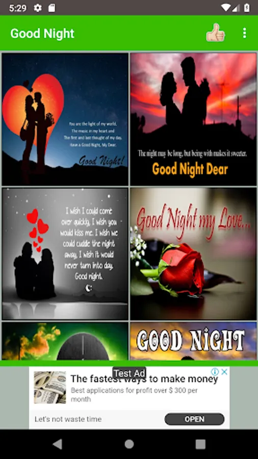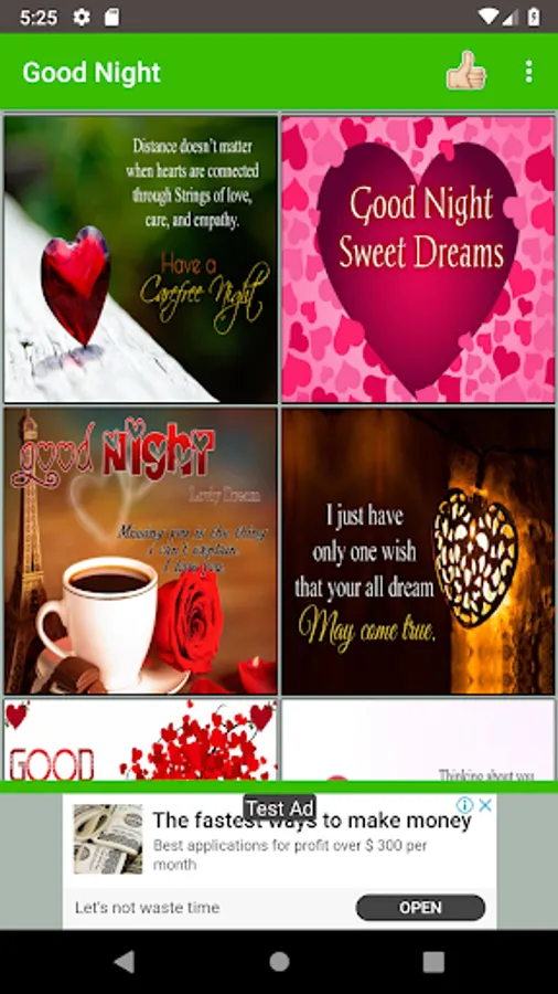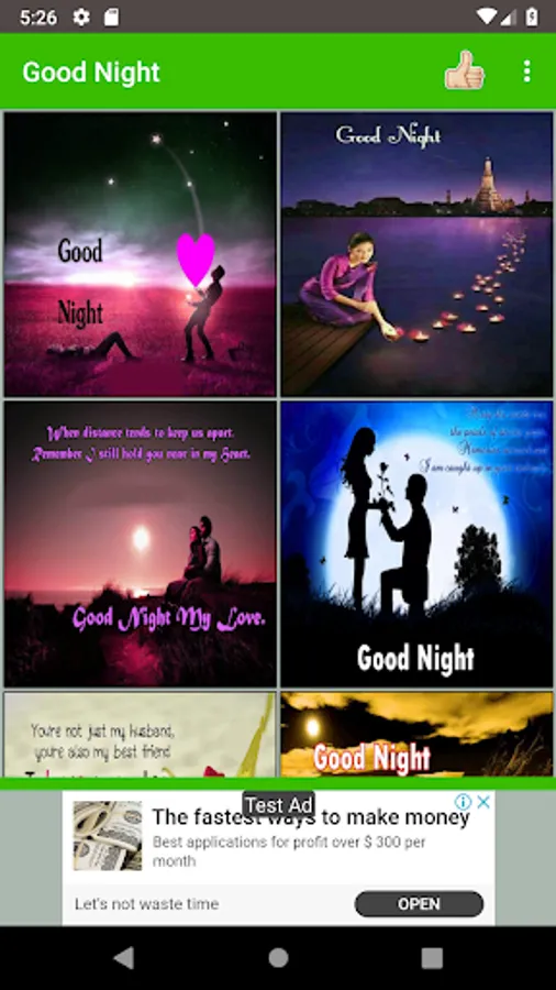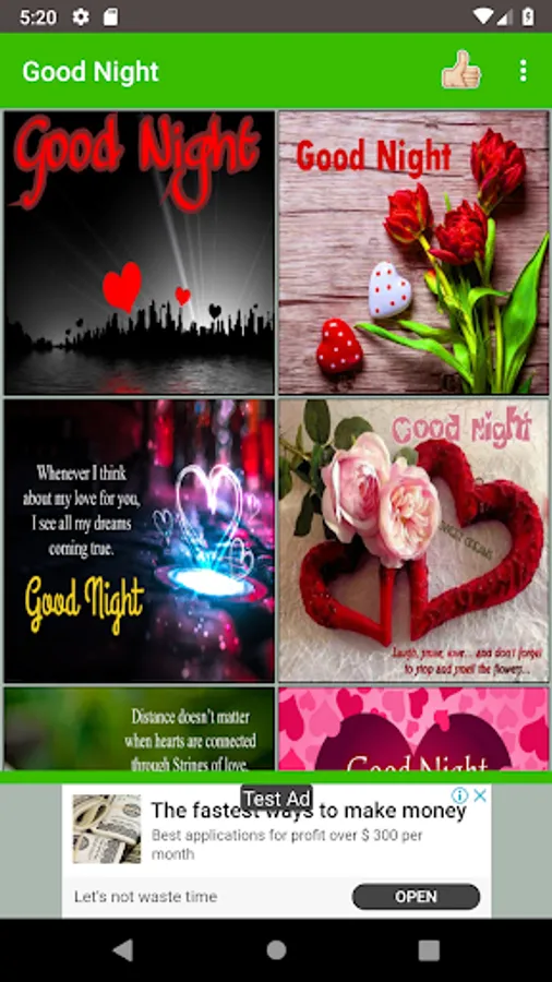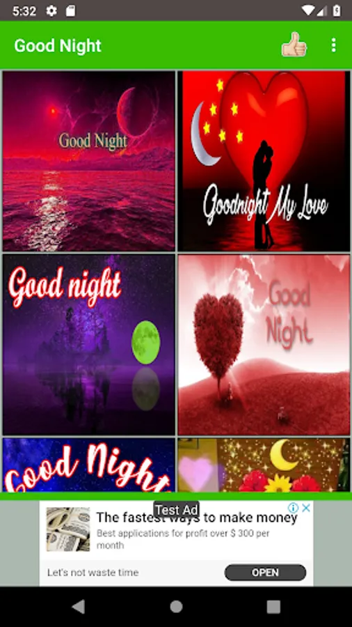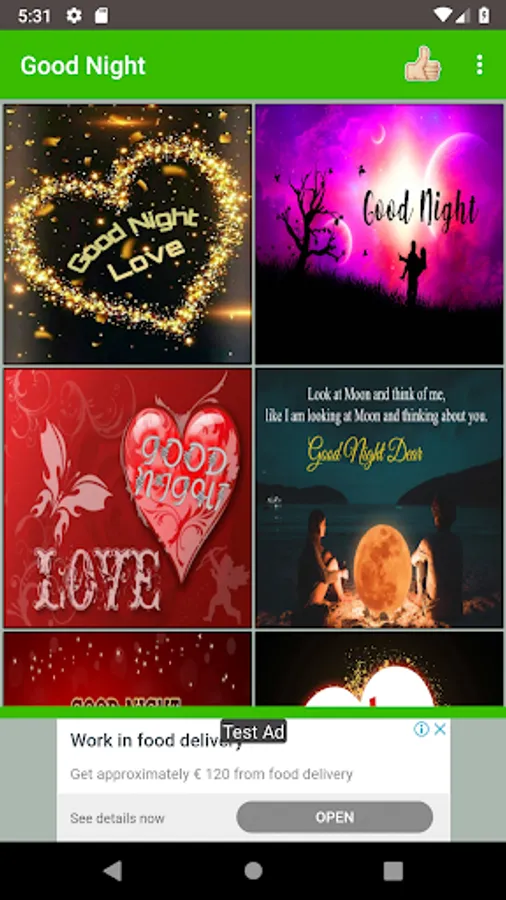 This all in one app is a single point of utility for sending awesome collection of good night love images to the one you love most, your sweetheart, etc,. This is a collection of cheerful night wishes that will not only spread the positive vibes but also expresses your likeness and care for your loved ones. You can also share more collection of romantic love messages, love images for whatsapp, good night quotes, i love you pictures, birthday candles quickly to your loved one's. This app saves time and effort from laborious typing and searching. Internet is needed only to share images to social messengers but not required to view photos. You can set any image as your phone wallpaper with single tap. Also, you can save any image as your favorite one and will be stored to app folder of your phone file manager. Have a good sleep by sending cute night wishes to your loved ones.