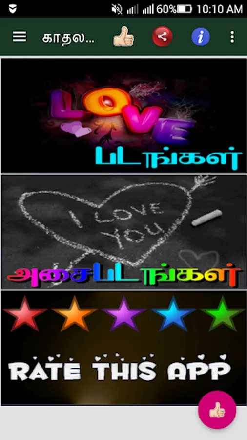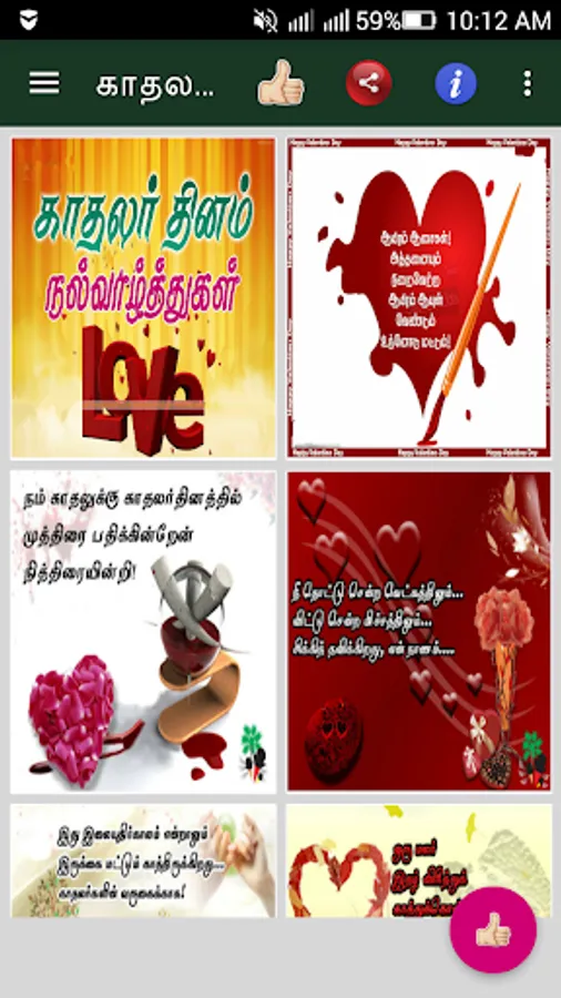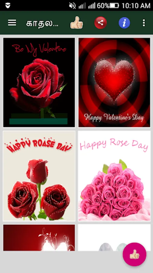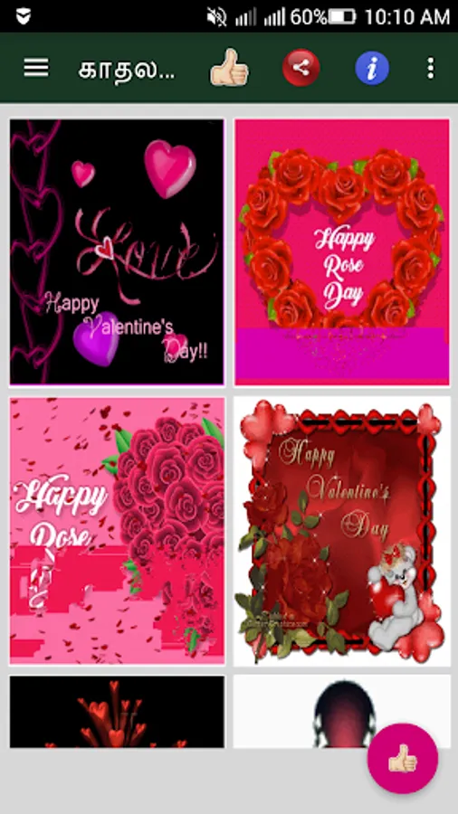 GIF Valentine's day app is a beautiful collection of tamil images & animated gif images. Using this tamil app, you can share tamil valentine’s images & animated gif images to your loved ones via social messengers like whatsapp, hike, facebook, etc, ...Celebrate Valentines Day with beautiful pictures and share them to your loved one's. This is free software application with better UI Application.