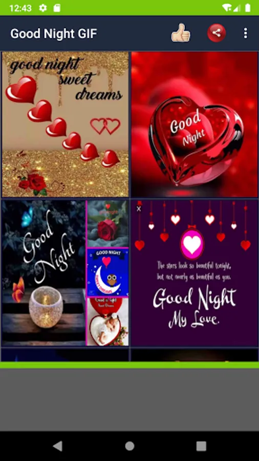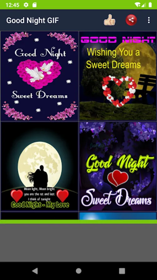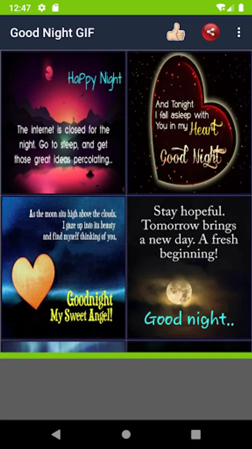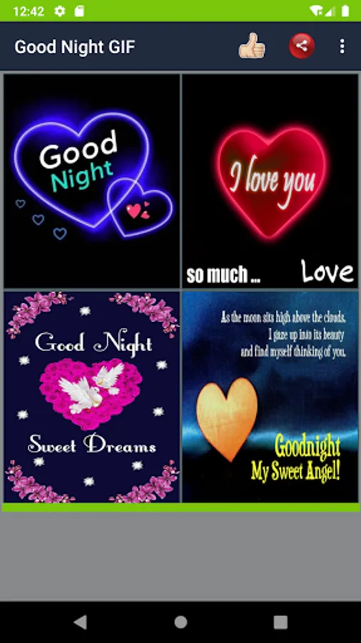Discover more beautiful images for wishing good night, inspirational quotes and love quotes on this app. This app is a single point of utility for sending awesome collection of animated GIF images for night with romantic images to the loved ones ,your sweetheart, etc, .. This is a collection of cheerful good night wishes that will not only spread the positive vibes but also expresses your likeness and care for your loved ones. Share your night wishes as a GIF to anyone with instant sharing option. This app also contains love images, romantic love messages for girlfriend, boyfriend, etc,...