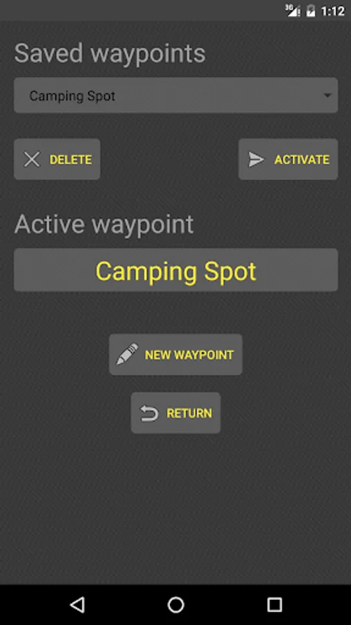Here you can create, delete and activate custom waypoints. Any saved waypoints will appear in the drop-down menu. Selecting a waypoint in this menu will allow you to immediately activate or delete it. If you activate the waypoint, any navigation info on the main page will now point to this waypoint. You can review the currently active waypoint in the field below the drop-down menu (note that tapping this field will remind you of the coordinates of the active waypoint).