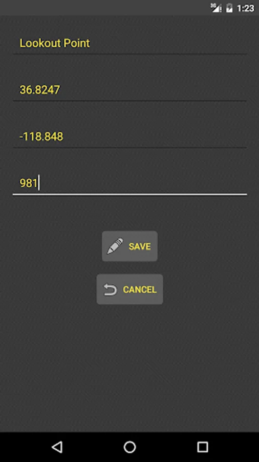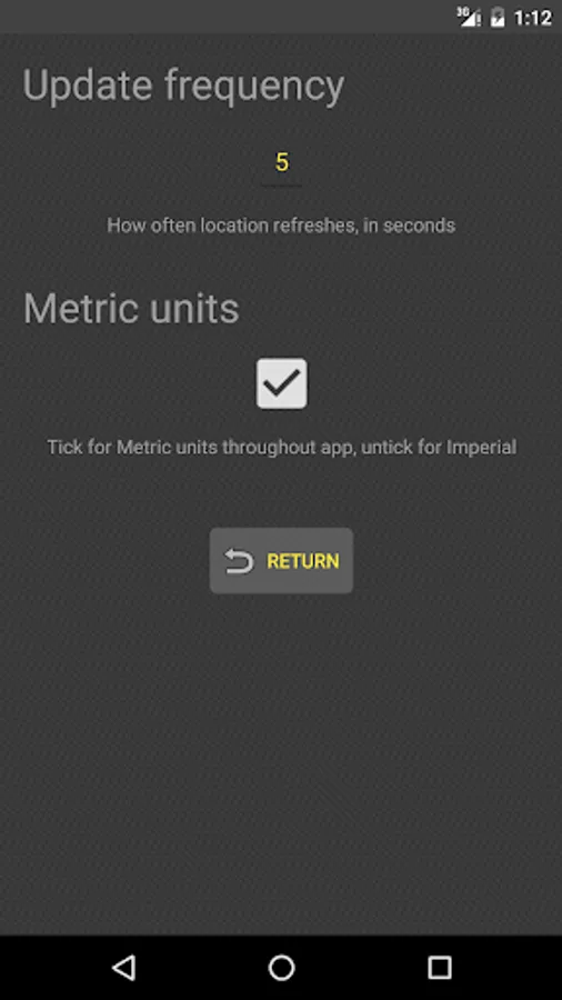 Here you can modify core settings for the app. Currently there are two fields. The Update Frequency field controls how often the app queries for new GPS readings. A smaller value means more frequent updates, but a higher battery usage. The Metric Units field speaks for itself - it will control the units used to both display and enter information throughout the app.