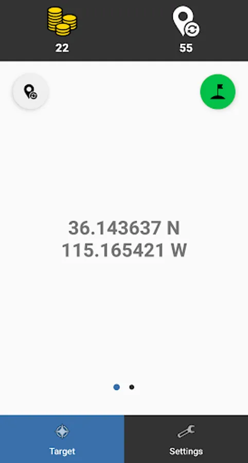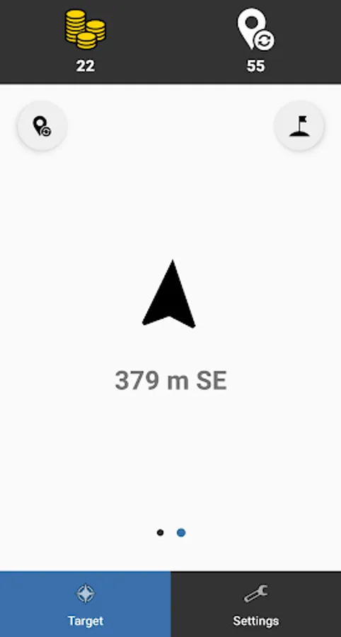 The first page shows your destination's coordinates. Tapping on them will open your favourite mapping app, with a marker placed at the target. Google Maps with offline coverage is recommended. Next is a directional display, which shows the distance and compass bearing to your target in real-time. It also includes a pointer which updates based on your location trail. Simply start walking, and the arrow will show you which way to turn!