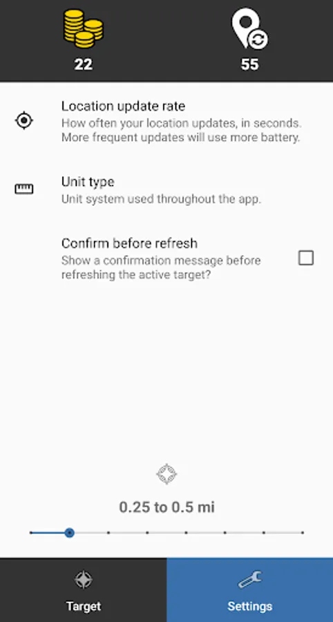 If you reach a target, you'll be rewarded with Coins and Refreshes. Coins are simply an overall score; they measure how many places you've been, and how far you've travelled to get to them. Refreshes allow you to generate new targets, with each one costing a single Refresh. If your Refresh balance gets low, you'll automatically receive more the next day.