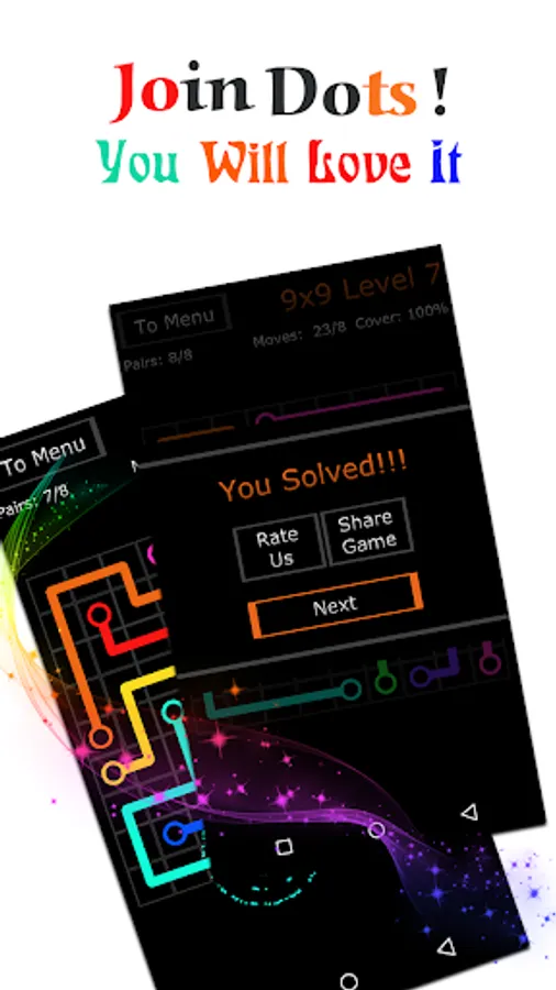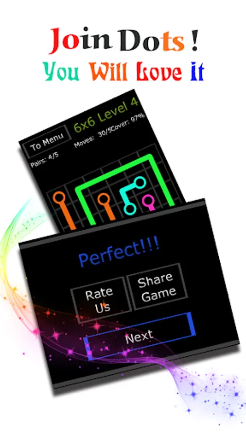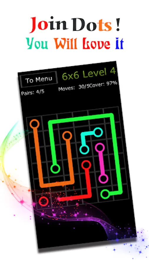 Connect matching color dots with a line to same color dots to create a flow or a pipe. pair all color dot and cover the entire board to solve each level in Flow connect & solve each puzzle in minimum moves.