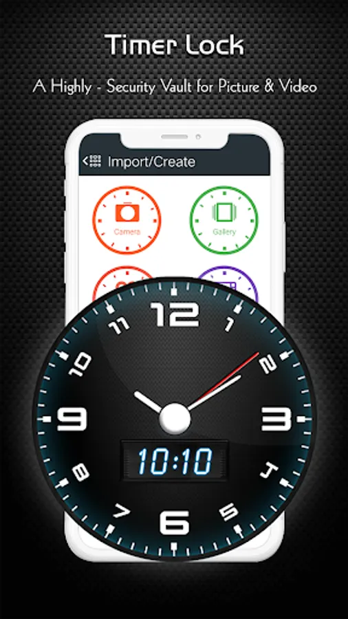 A high-security Timer Lock for photos and videos hidden in a clock With the new Timer Lock app, it is not only a timeless clock with an alarm function, but also a high security vault for your personal photos and videos. The vault itself is completely invisible, hidden in the design of the clock.
