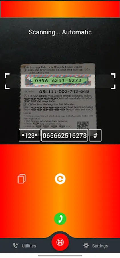 Scratch the overlay on the card, open the app and put the camera in the code container, the app will automatically scan and display the code on the screen. You can Copy or Top-up right away.