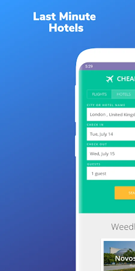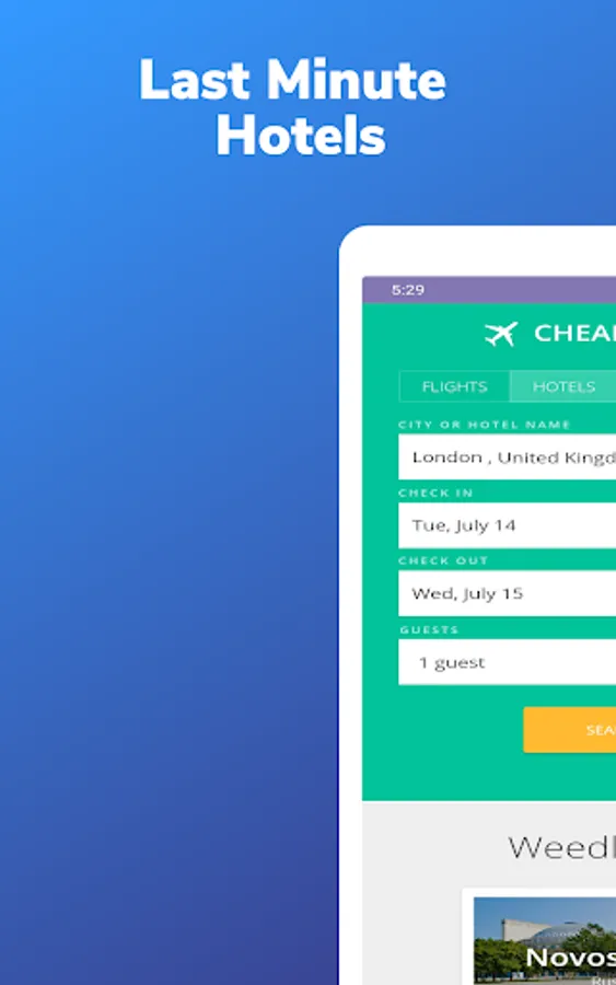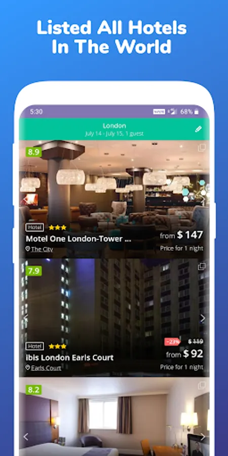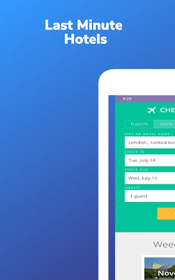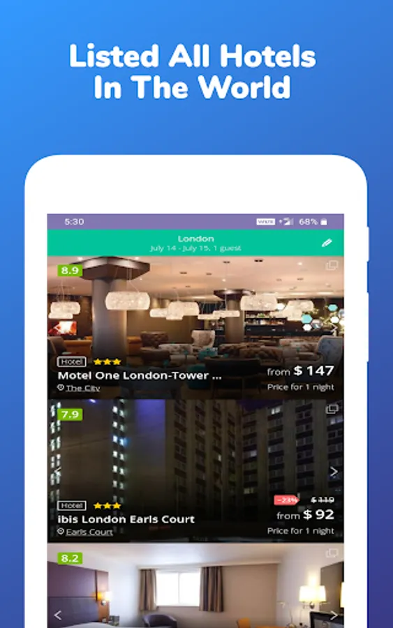 Last minute hotels booking app compare prices over providers such as hotel tonight, booking com, Vrbo Vacation Rentals, Priceline, Expedia, Hotels com, Travelocity, Airbnb, HomeAway, Tripadvisor, Orbitz, Choice Hotels, Trivago, Dayuse, Hotwire com, etc. Last minute hotels booking app lets you find cheap hotels in a single click. We compare the prices of tons of online hotel booking websites to find the lowest price for every low-cost hotel and extended stay worldwide. The latest last-minute booking app allows users to book last minute hotels with cheap hotel deals, offers, and discounts, and now it's easy to reserve budget hotels even at the last minute travel.