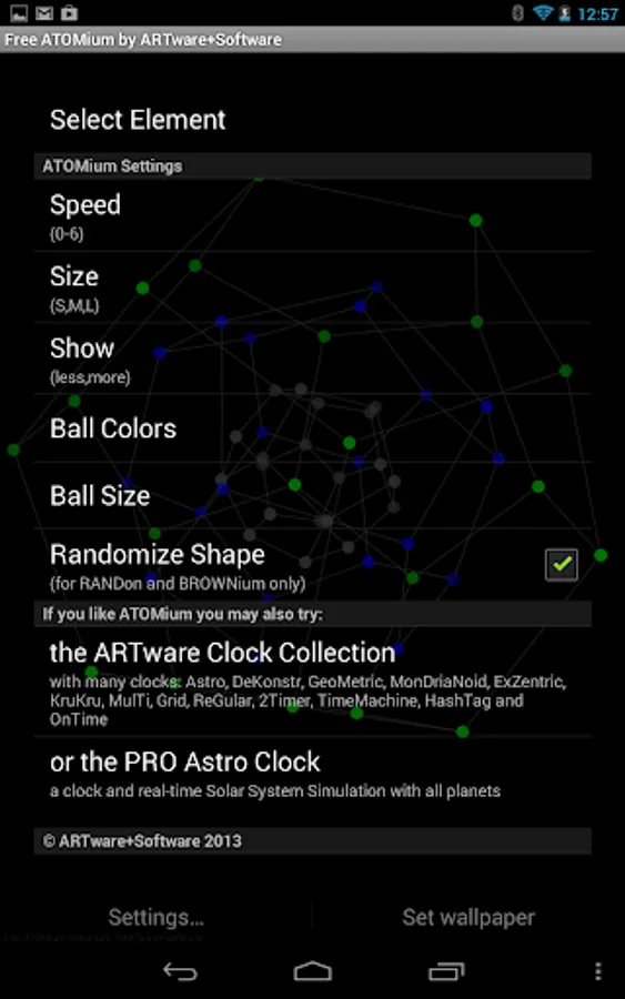 ATOMium is a FREE Live Wallpaper (LWP) presenting fictitious atoms like RANDon, BROWNium, DiCUBium, BALLium and FIFTYon moving in simulated 3D space as kinetic art. The Wallpaper lets you adjust colors, size, ball size and animation speed for an entertaining 3D display on your device.