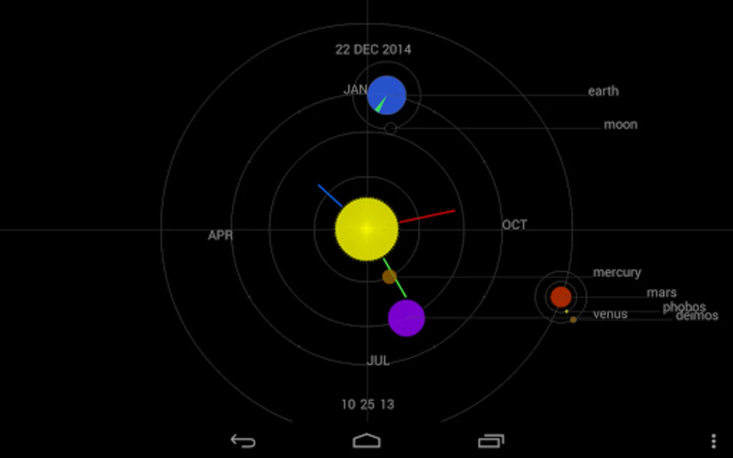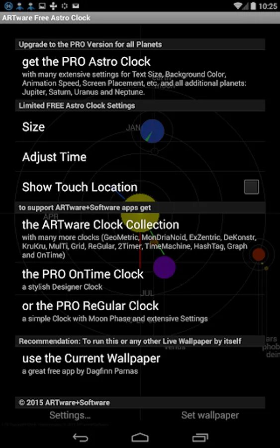 The FREE ARTware Astro Clock is a Live Wallpaper clock and a real-time simulation of the inner Solar System, including the planets Mercury, Venus, Earth and Mars to scale for either size or orbit. The moons of Earth and Mars (Phobos and Deimos) are included, without being to scale. Beside being a clock with date display the app is very educational in showing the inner planets and moons in relation to the Earth moving through the year. At each full hour an animation of the planet movements since the beginning of the year is shown. (it will take a few days after New Year to become obvious). Great for children, students and people with an interest in Astronomy. Constantly see where you are in the Solar System! If you like this app you will love the PRO Astro Clock showing all planets (Mercury, Venus, Earth, Mars, Jupiter, Saturn, Uranus and Neptune). The PRO version provides also extensive settings like AM/PM time-format, (widget like) screen placement, text size, animation speed, background color and many more options.