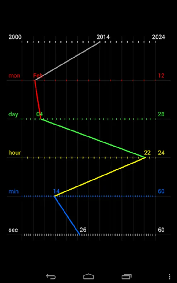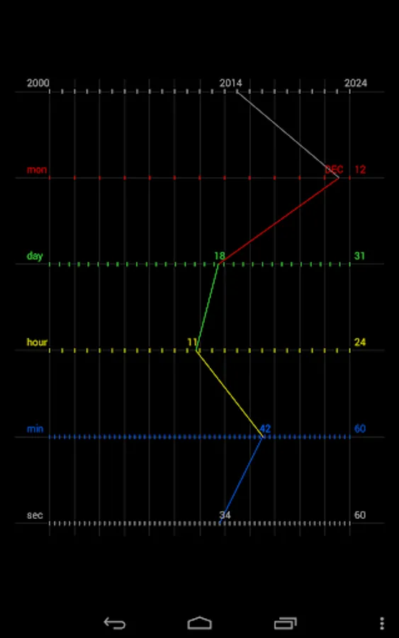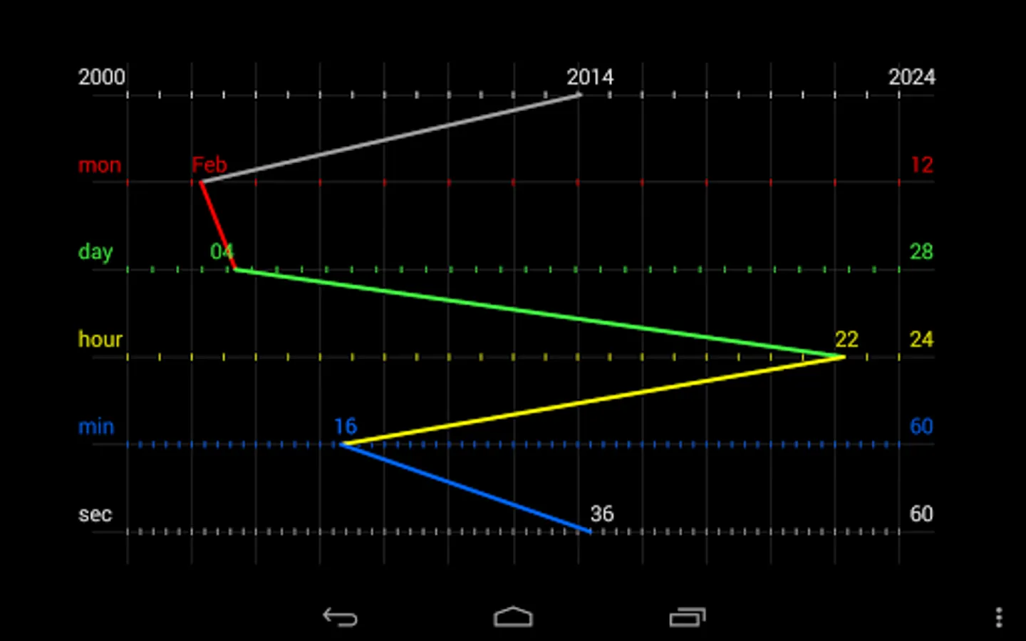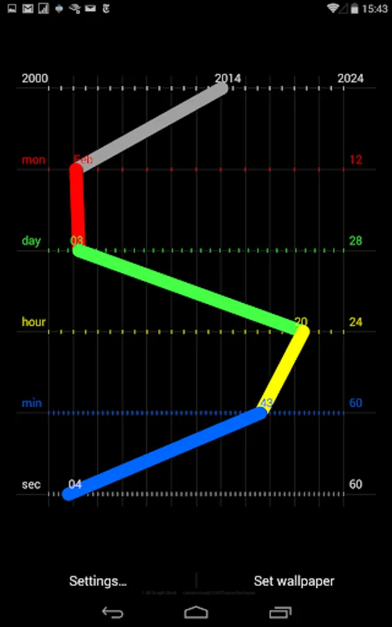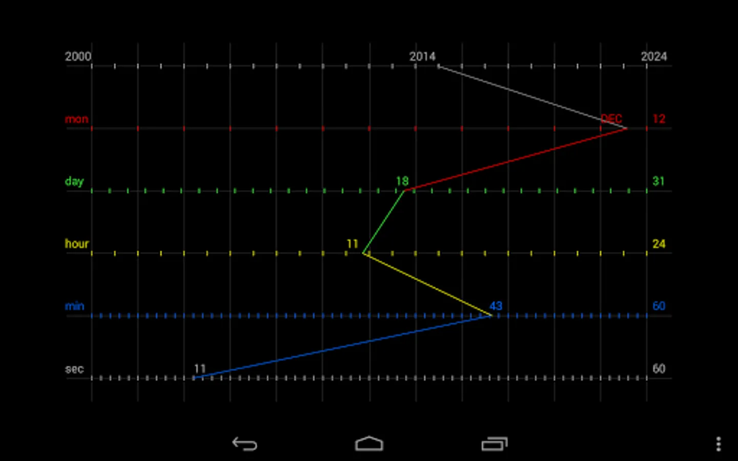 The ARTware Graph Clock is a live wallpaper (LWP). The Graph Clock displays the year, month, day, hour, minutes and seconds in a new innovative/unusual way. It is not your regular Swiss Watch. We are to much used to the traditional way, where two or three hands of different length rotate around a common axis. This has worked quite well over the years for mechanical watches but it is now possible to examine new ways that may be more logical and descriptive. You can explain the alternative time display to your friends.