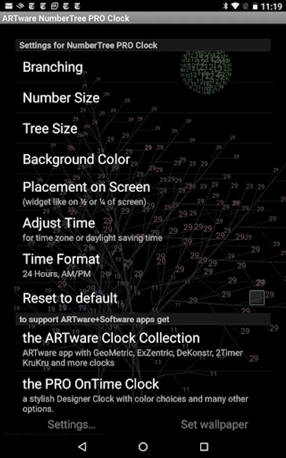 The ARTware NumberTree PRO Clock is a live wallpaper (LWP). The NumberTree Clock displays the hours, minutes and seconds attached as leaves to a tree.The date, month and day become the sun in the number landscape. This clock is as different as it gets from a Swiss Watch. The PRO Version has a bigger range for parameters to adjust and includes 24/12 hour setting.